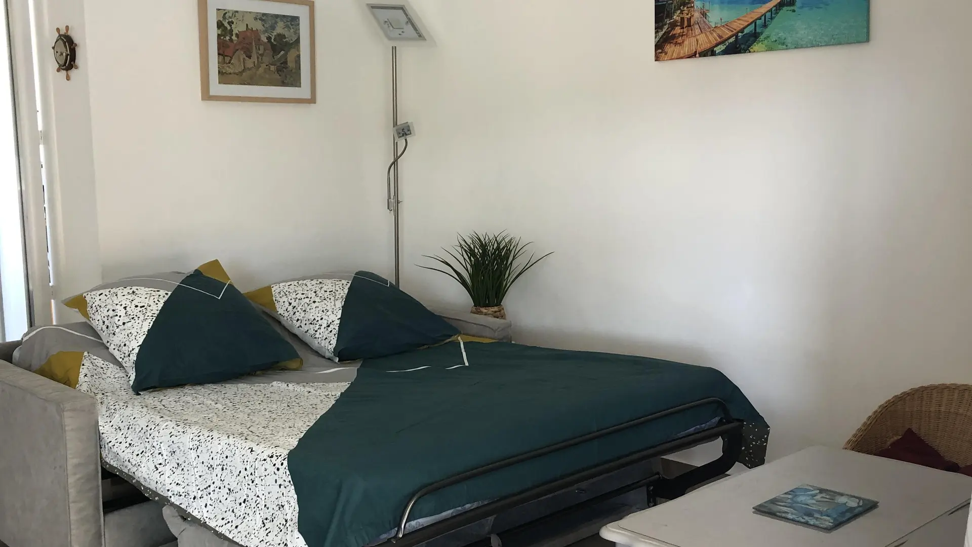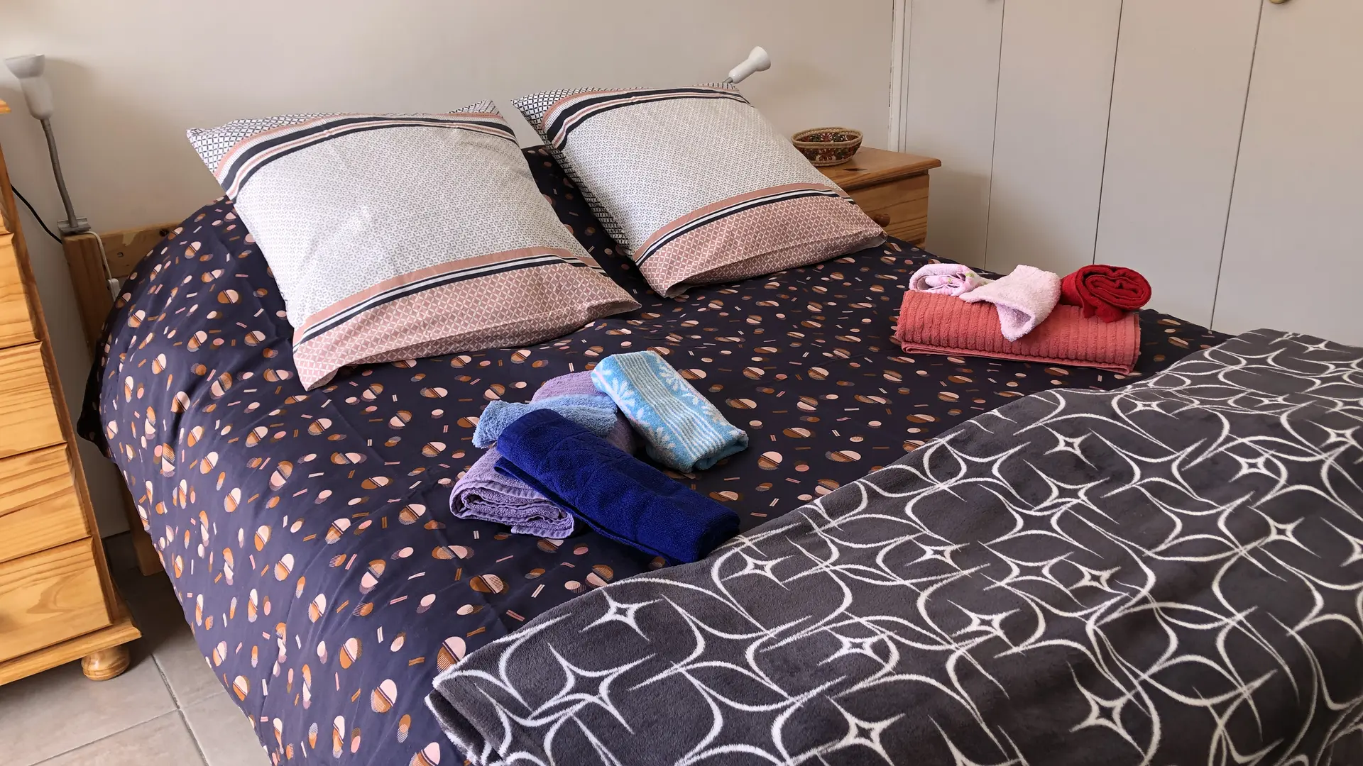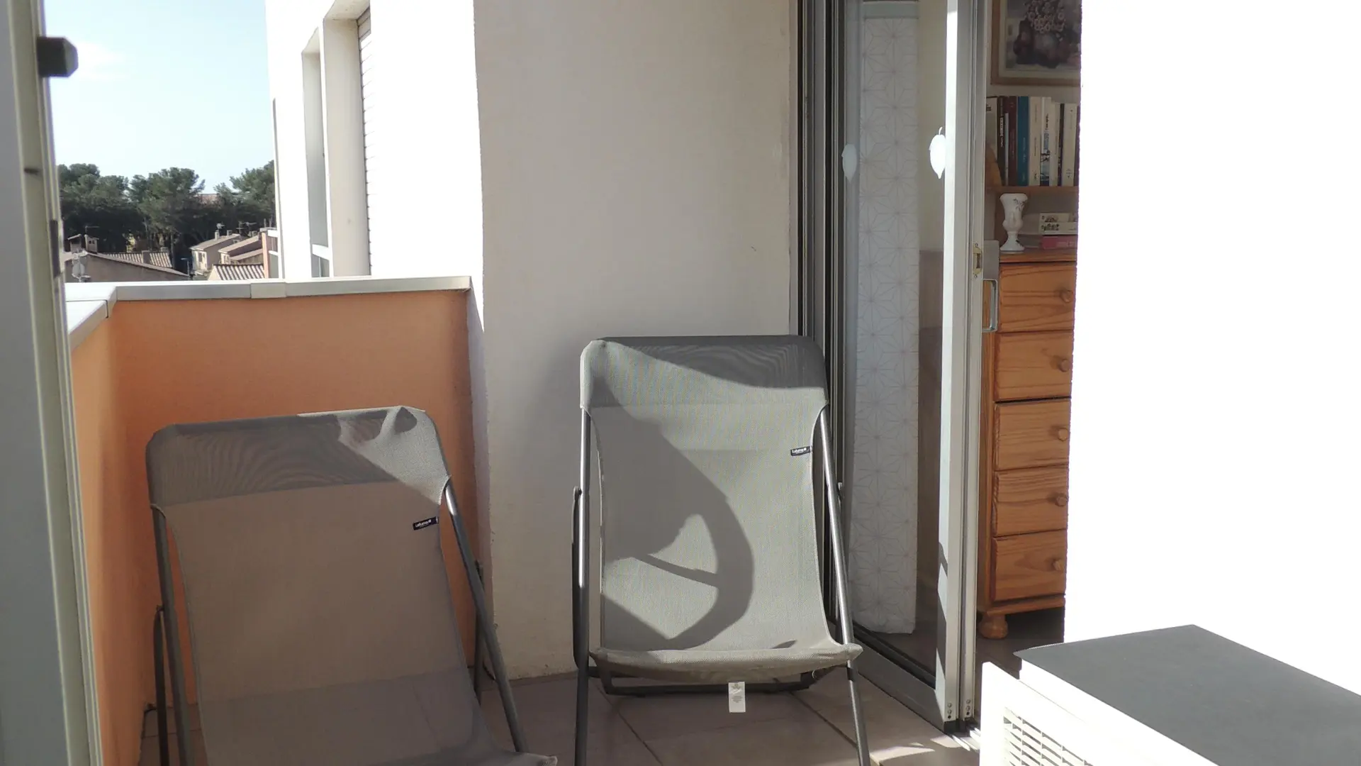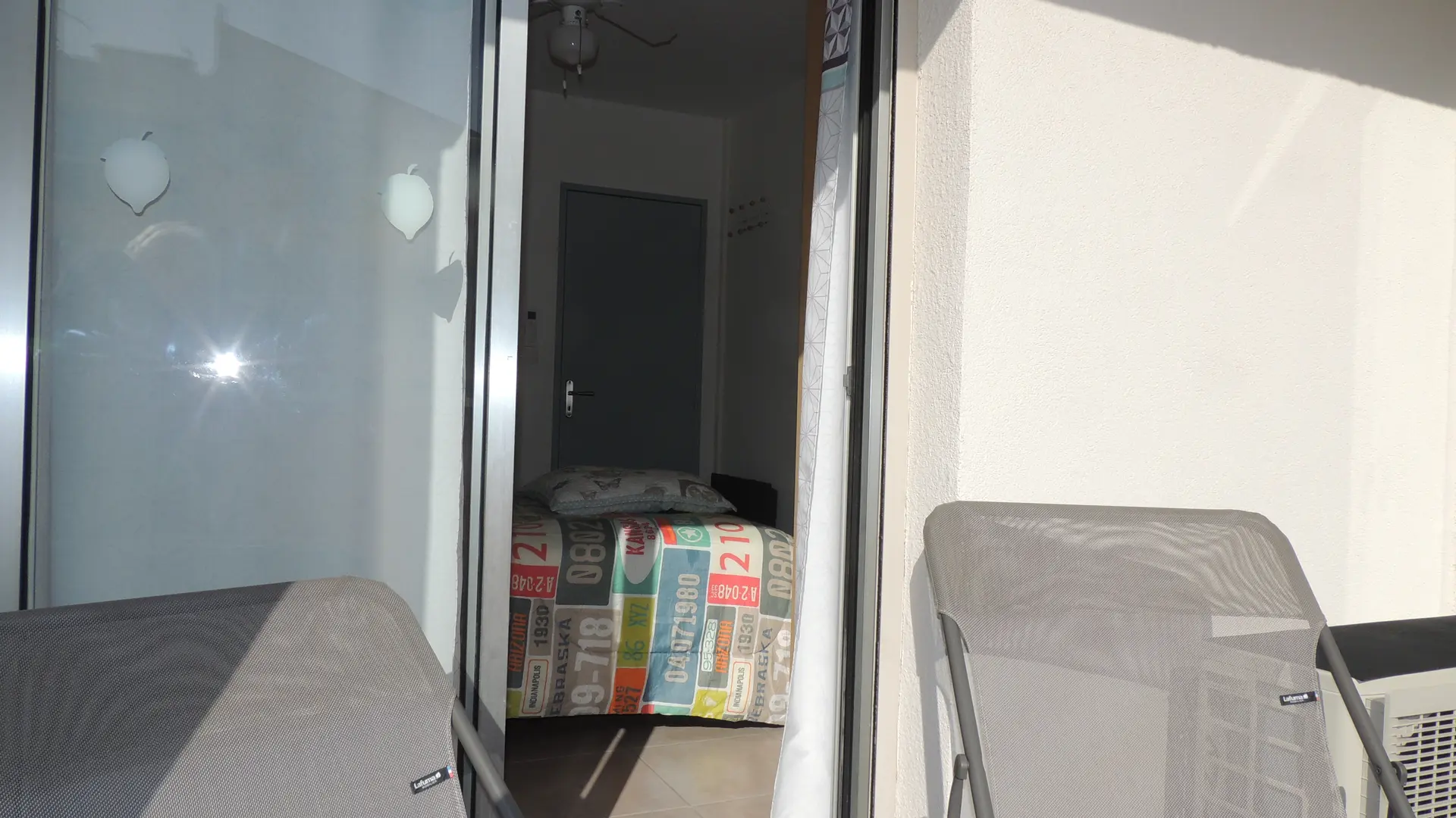 Klimatisiertes Schlafzimmer mit Fenstertür zum Balkon: Doppelbett mit allem Komfort - 2 Kopfkissen pro Person - Kleiderschrank - Kommode - Nachttisch - Bücher zur Verfügung - Radiowecker.