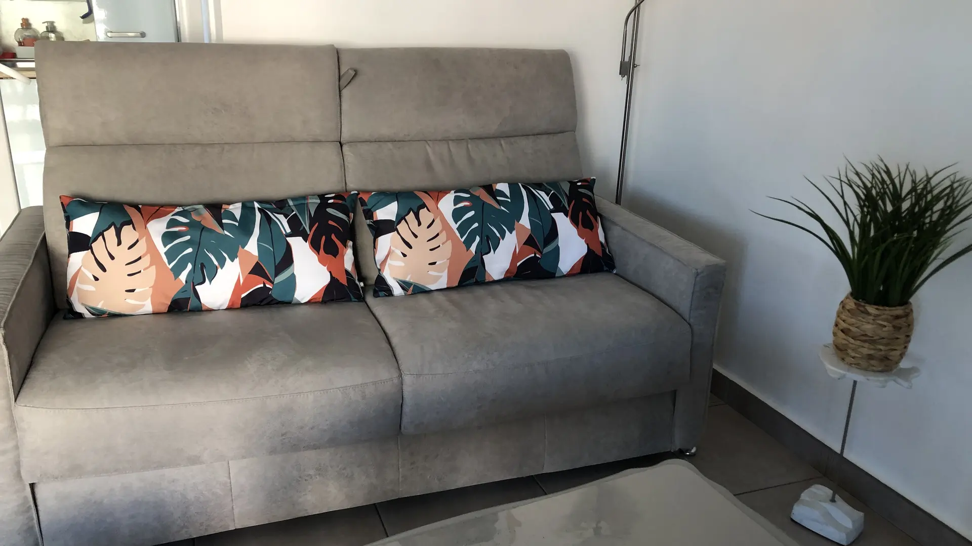 Wohnzimmerecke: neues Sofa mit aufklappbaren Kopfstützen, 3-Sitzer, Schlafgelegenheit 140 cm - Flachbildfernseher - DVD-Player - Couchtisch - kleiner Sessel für Kinder - Hocker -.