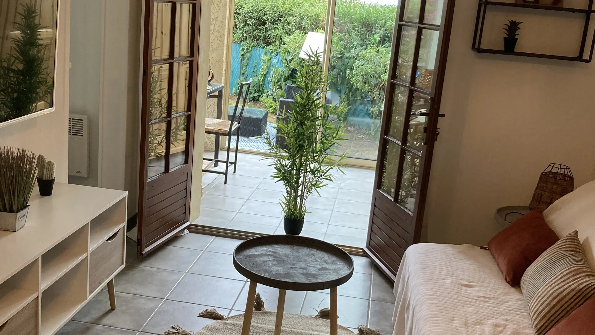 Charmante T2 Südlage mit geschlossener Loggia, die auf einen 100m2 großen Privatgarten führt und Zugang zum Gemeinschaftspool bietet.