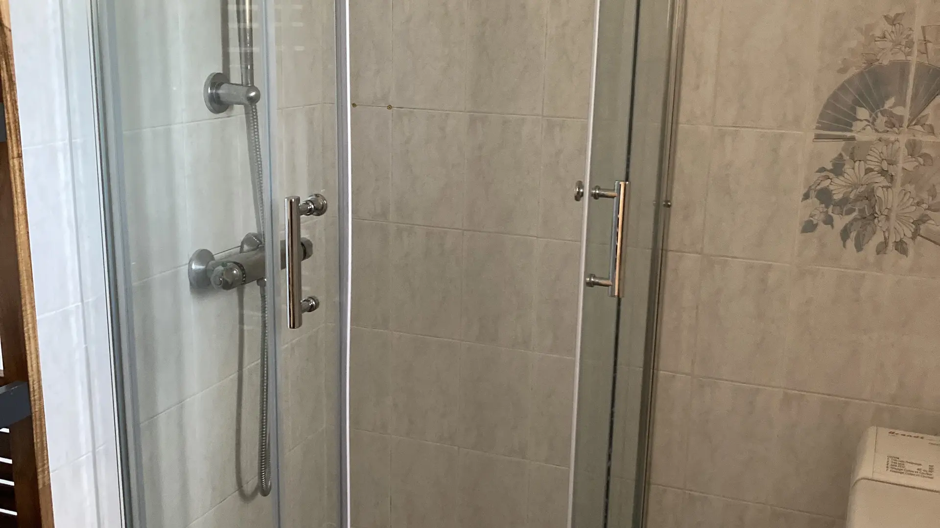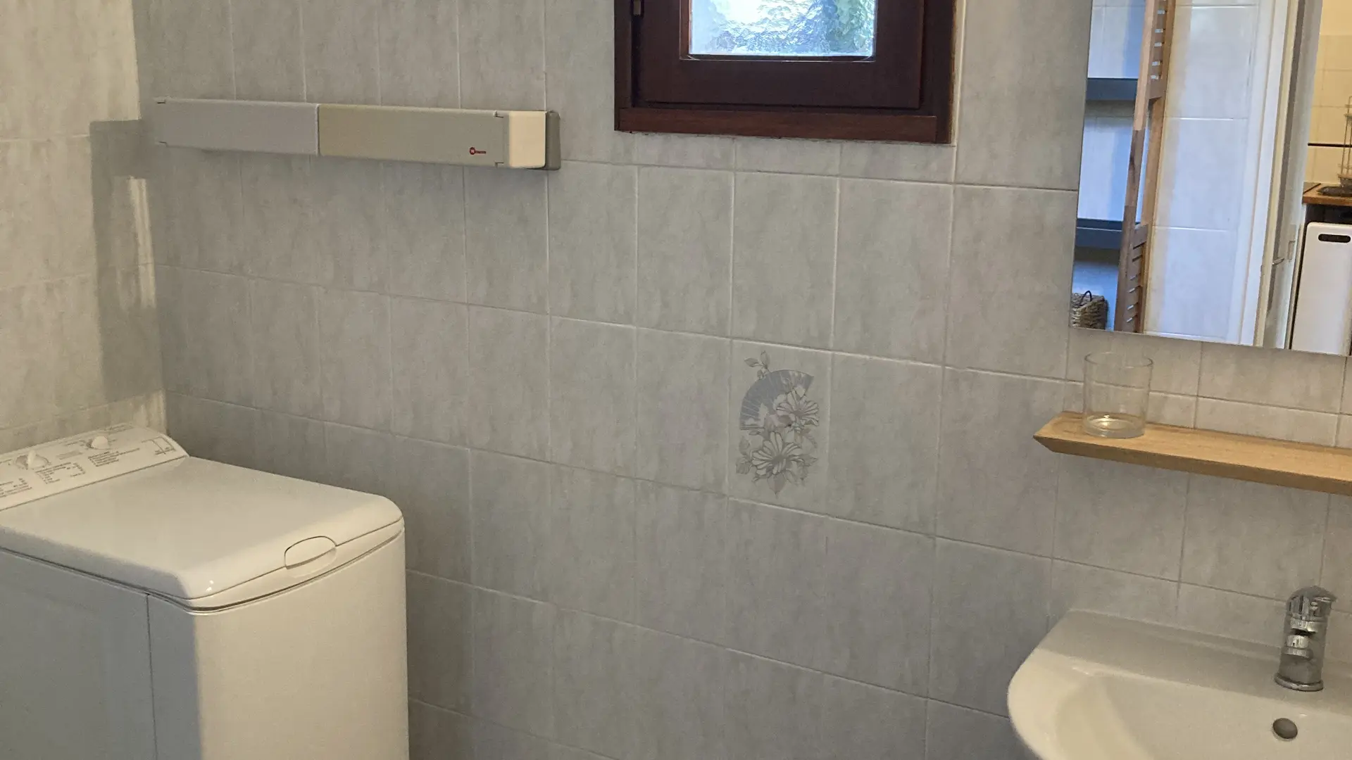 Das Badezimmer ist mit einem Handtuchtrockner ausgestattet.