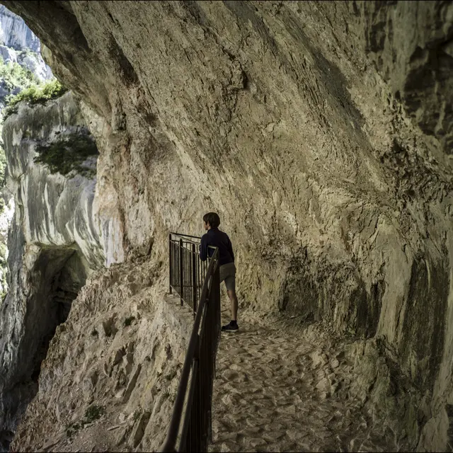 Située à la fin du Sentier Blanc-Martel et au début du sentier du Couloir Samson, cette baume au milieu du tunnel du Baou offre l'une des vues les plus sauvages des Gorges du Verdon.