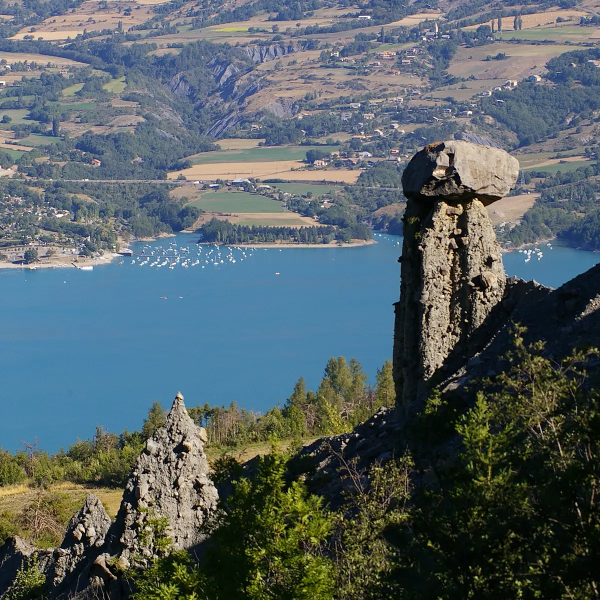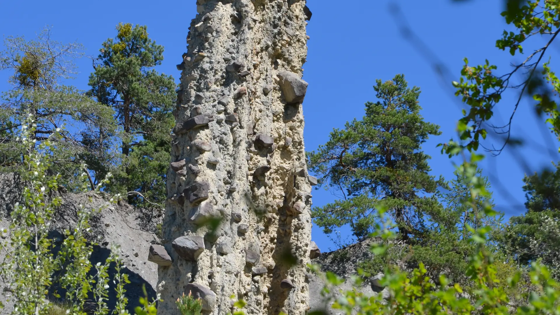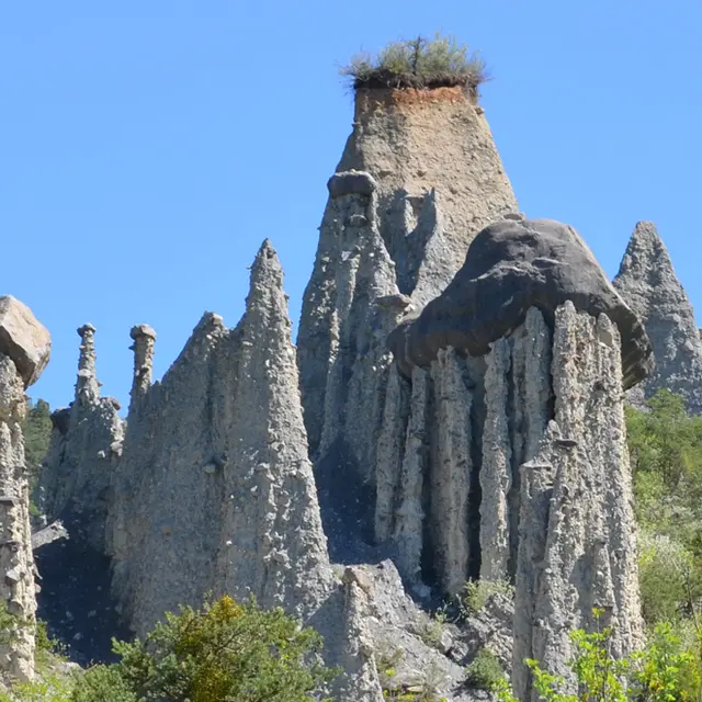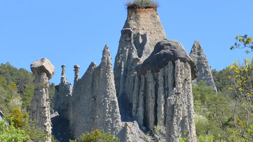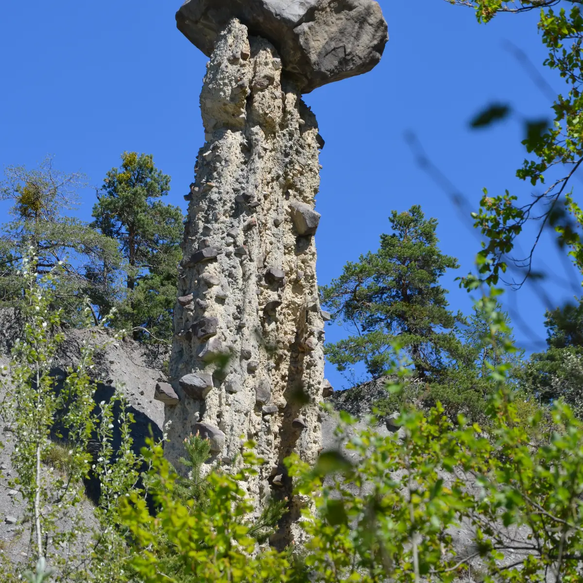These geological formations are the result of rain and torrential erosion, and can be recognised by their tall columns topped by a rocky cap. They are a must-see in the region. A short path will take you close to them.