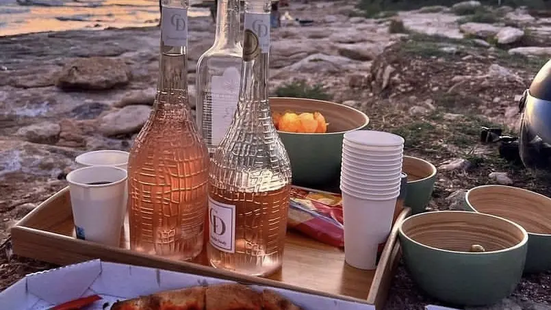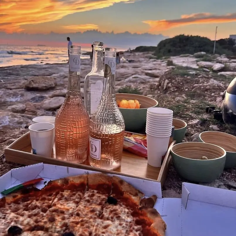Aperitif: white or rosé wine (in moderate doses of course!) with soft drinks for those who do not drink alcohol, chips, sausage, cocktail olives, and pizza.