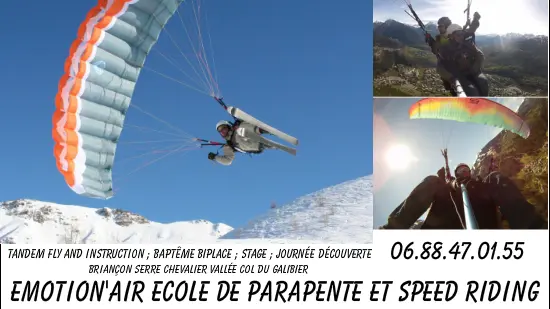 Open all year round for lessons: paragliding, speed flying, parakite, monosurface, winch, SIV in the off-season at Lake Serre Ponçon, speed riding and parakite in winter at Serre Chevalier and Col du Lautaret.