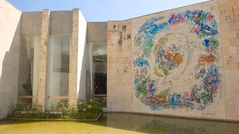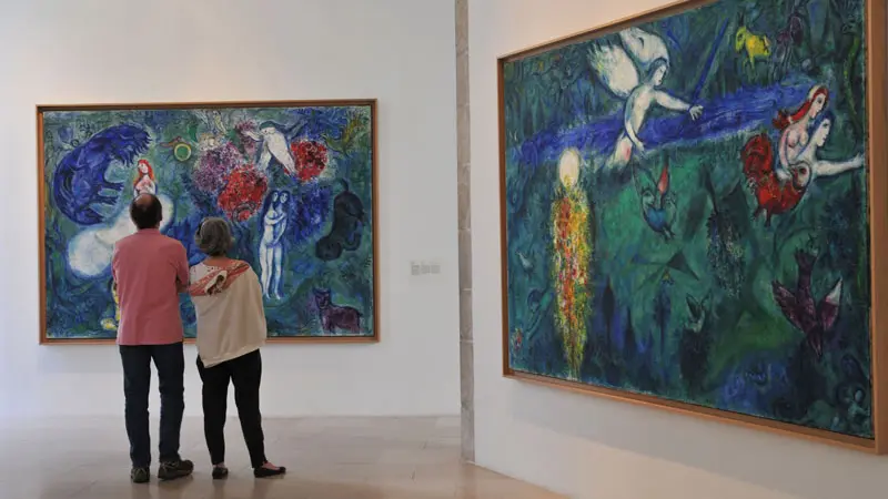 The permanent collection is the biggest public collection of works by Marc Chagall. It is organized around the set of works produced by the painter on the Old Testament themes, supplemented by a large number of works of secular or religious inspiration: over 400 painting, gouaches, drawings, wash drawings and pastels. The museum offers the visitor a first room containing twelve large-size paintings illustrating the first two books of the Old Testament, Genesis and Exodus. In a second, smaller hexagonal room are five compositions on the theme of the Song of Songs, another Old Testament book.