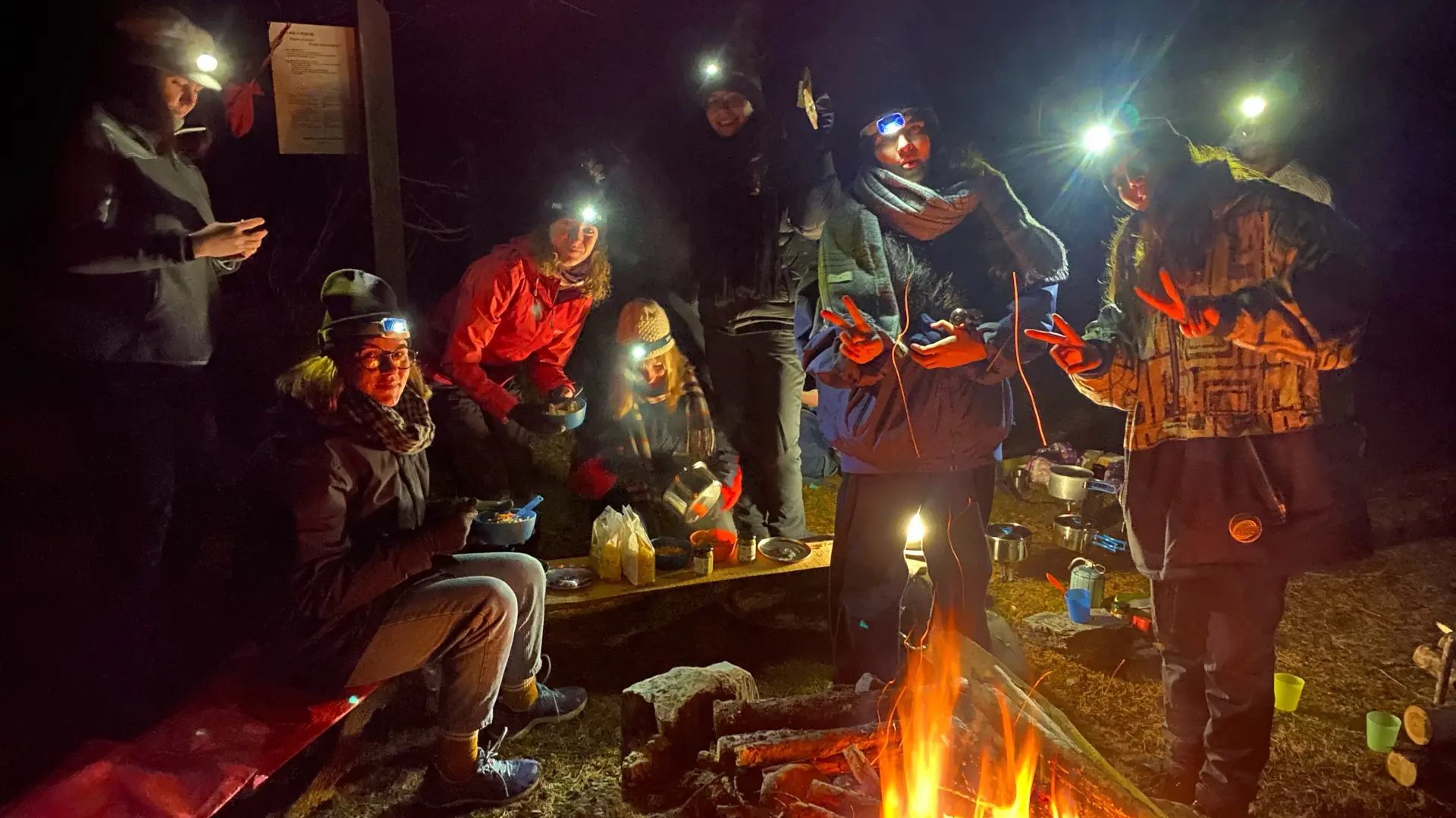 After a night-time snowshoe walk adapted to everyone's level (between 30 and 45 minutes), we arrive at the trapper's village.