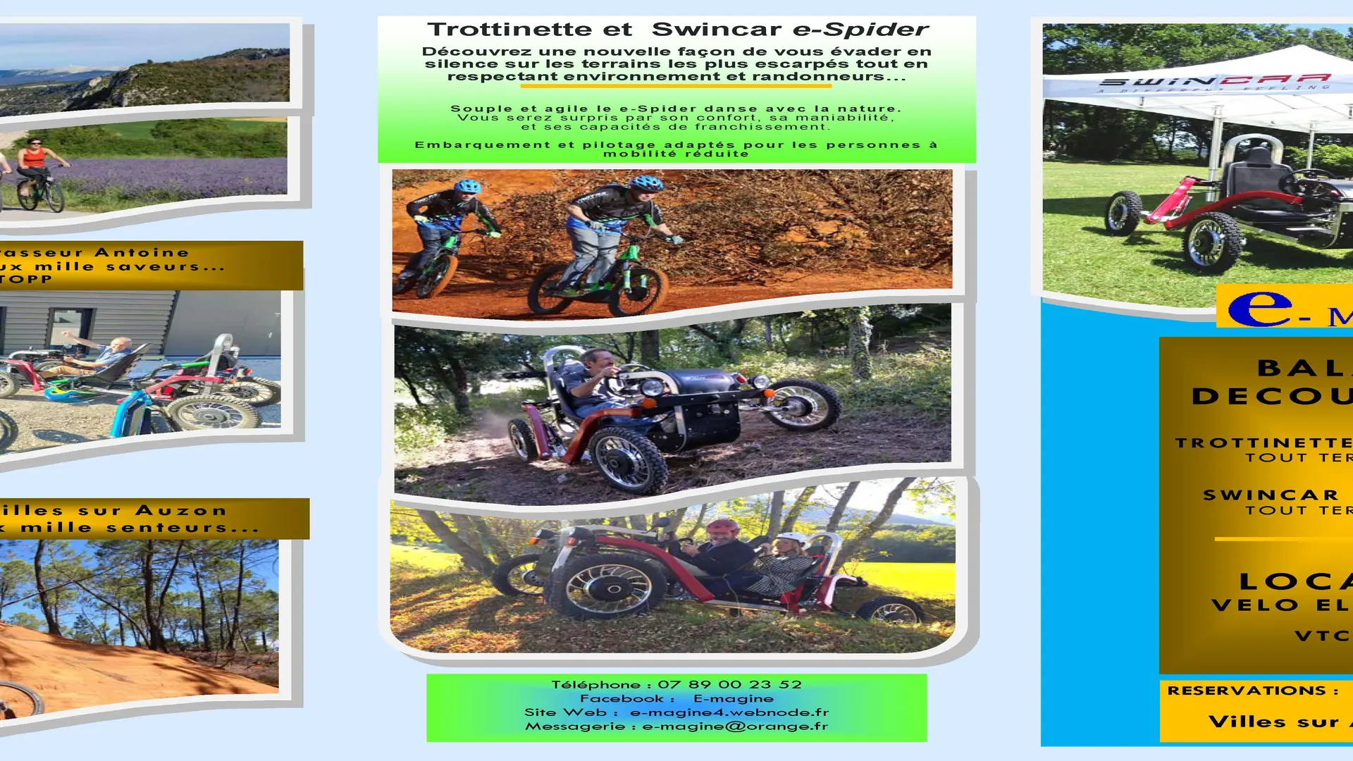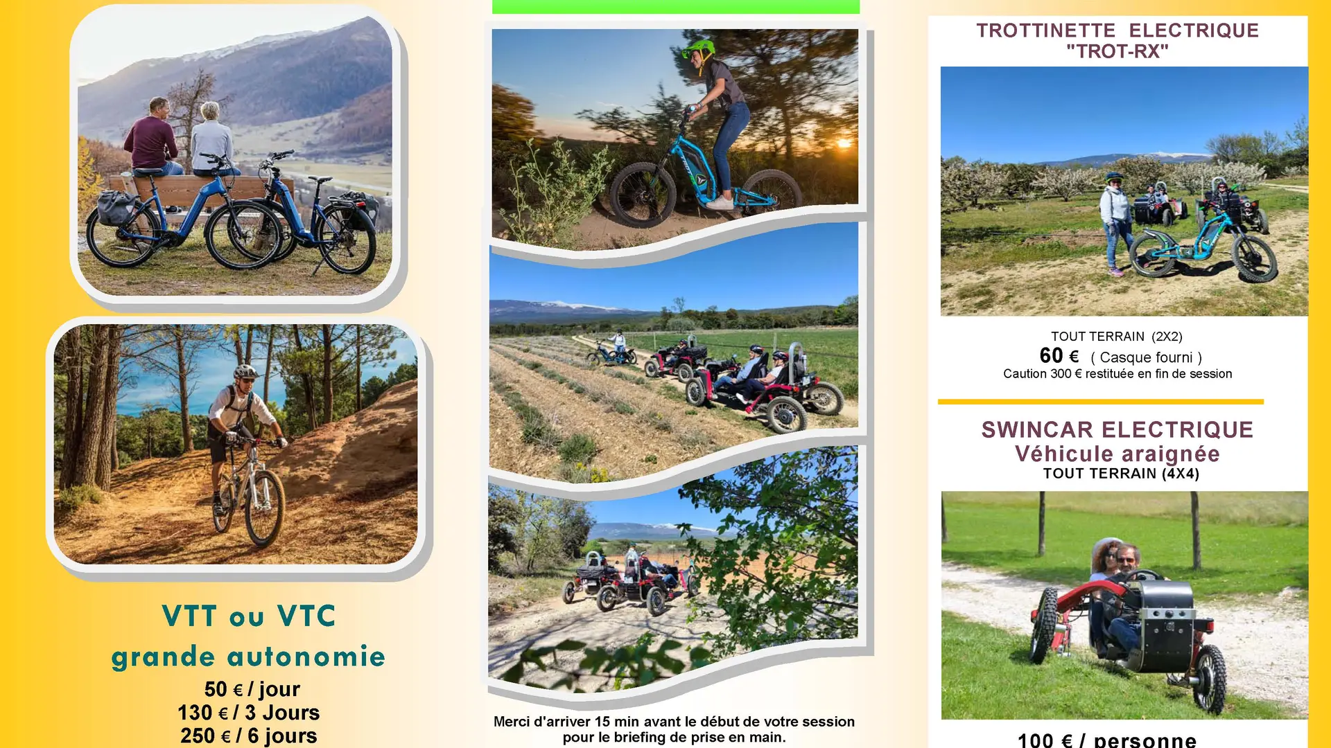 Discover our solo or duo electric 4x4 off-road Swincars during guided discovery rides off the beaten track. Off-road E-scooter rides and E-VTC and E-MTB rental are also available.
