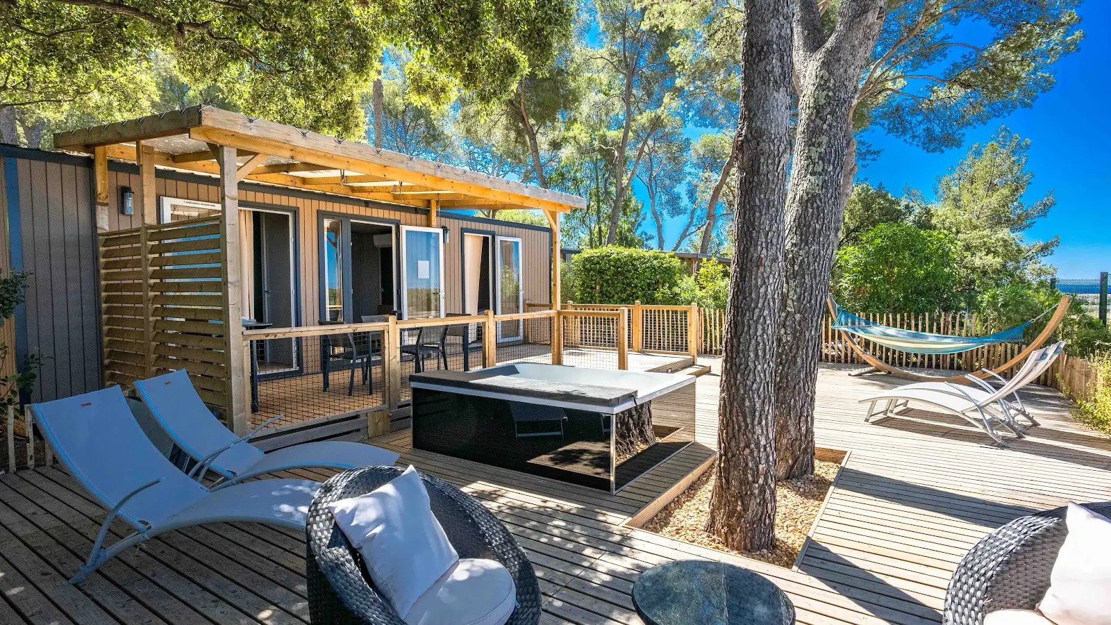 - La Villa des Copains® (10 people): two fully-equipped mobile homes, large shaded communal terrace, jacuzzi, hammock, view over the vines - a friendly, upmarket place to stay.