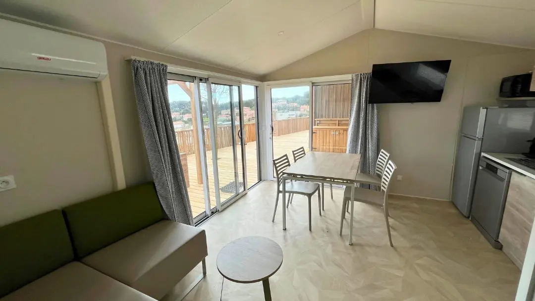 - Stay in a fully-equipped, air-conditioned mobile home or chalet, or on a pitch for a tent or camper van (dumping area available).