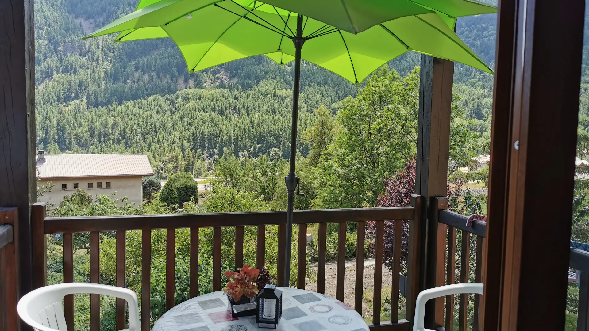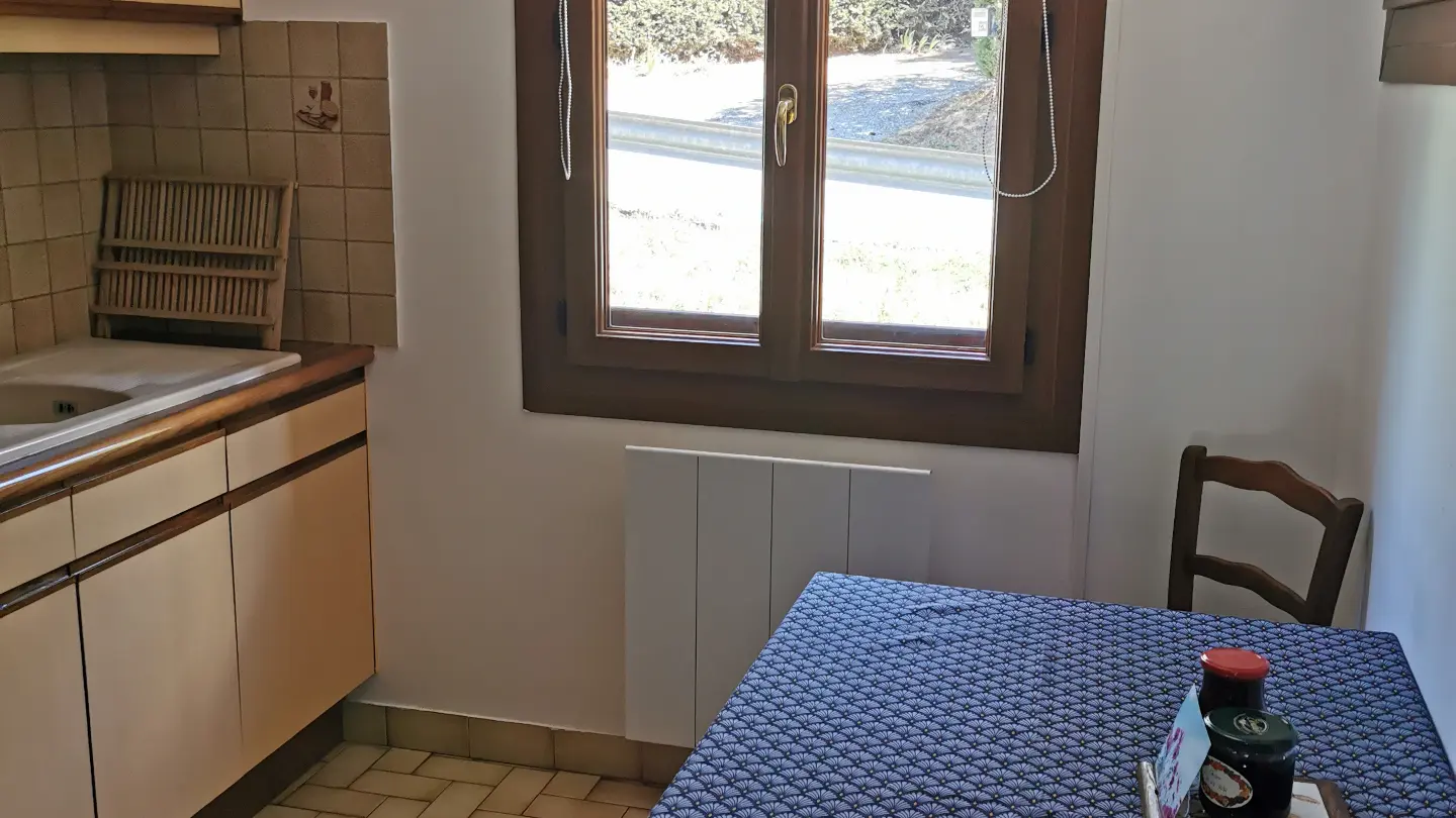 A one-bedroom furnished flat on the first floor of a chalet, featuring private parking, double glazing, electric heating, electric shutters, free fibre-optic Wi-Fi and a balcony with a table.