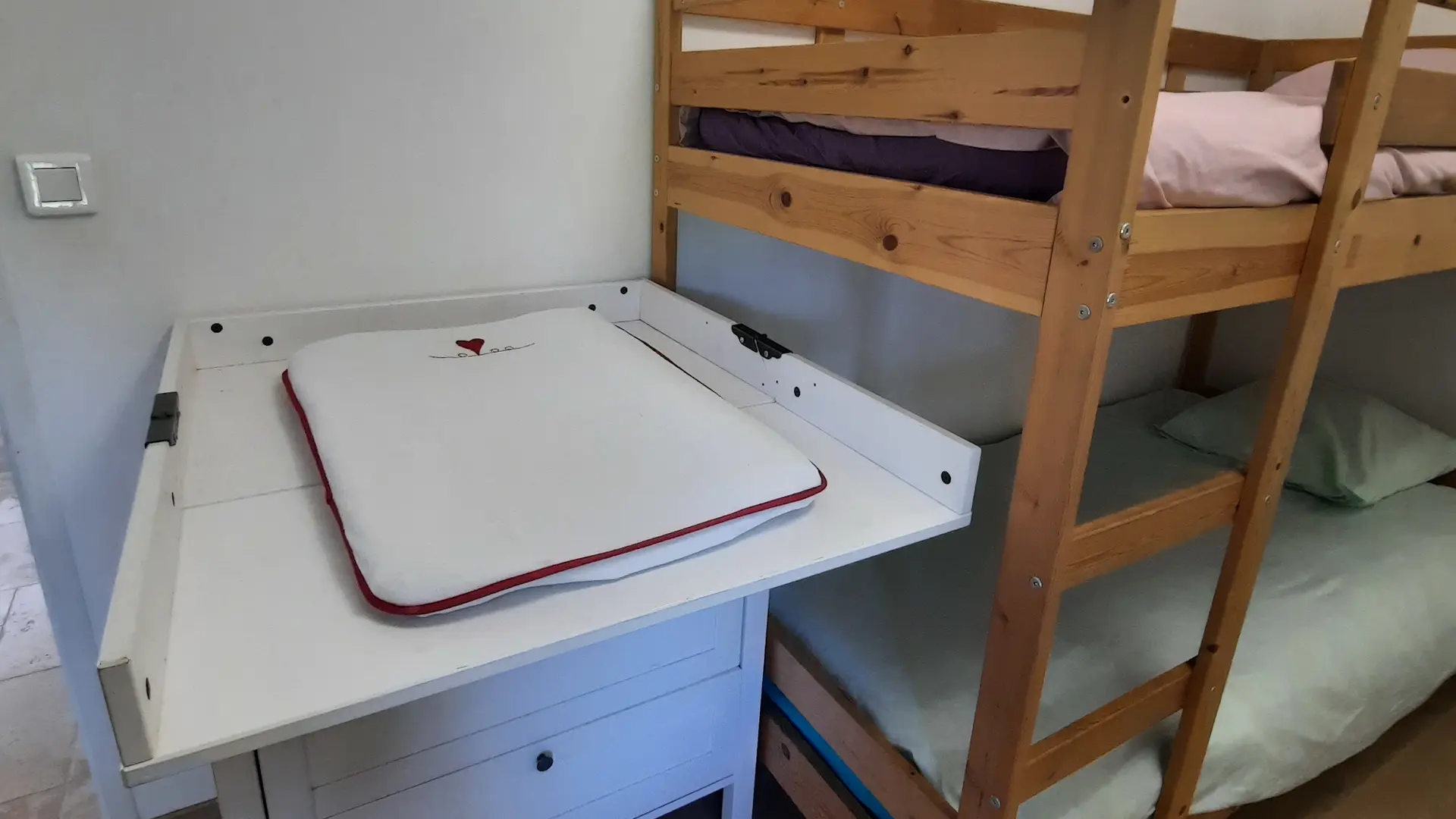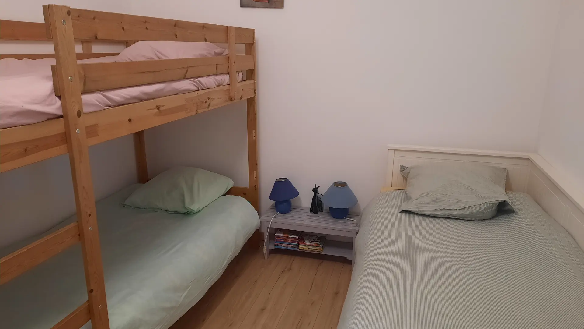 The accommodation also includes a master bedroom with a double bed and a children's bedroom with a bunk bed and a single bed.