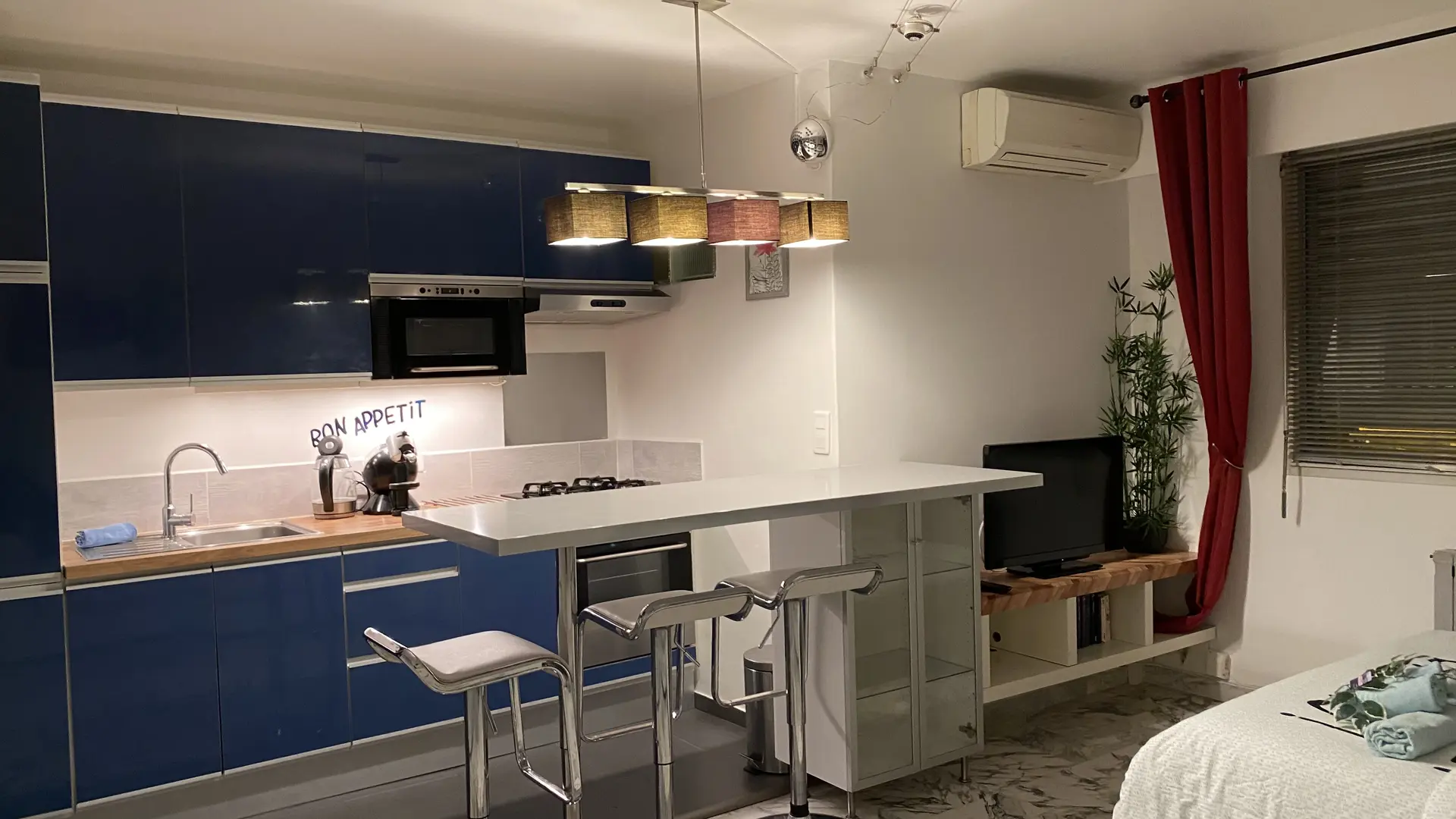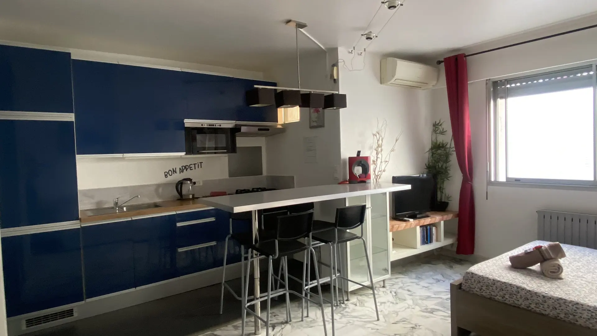 28 m² studio located on the 1st floor with elevator, wifi, air conditioning. The kitchen is equipped with an oven, induction hob, hood, microwave, cupboards with cooking accessories, fridge freezer, washing machine, bar table and 4 stools.