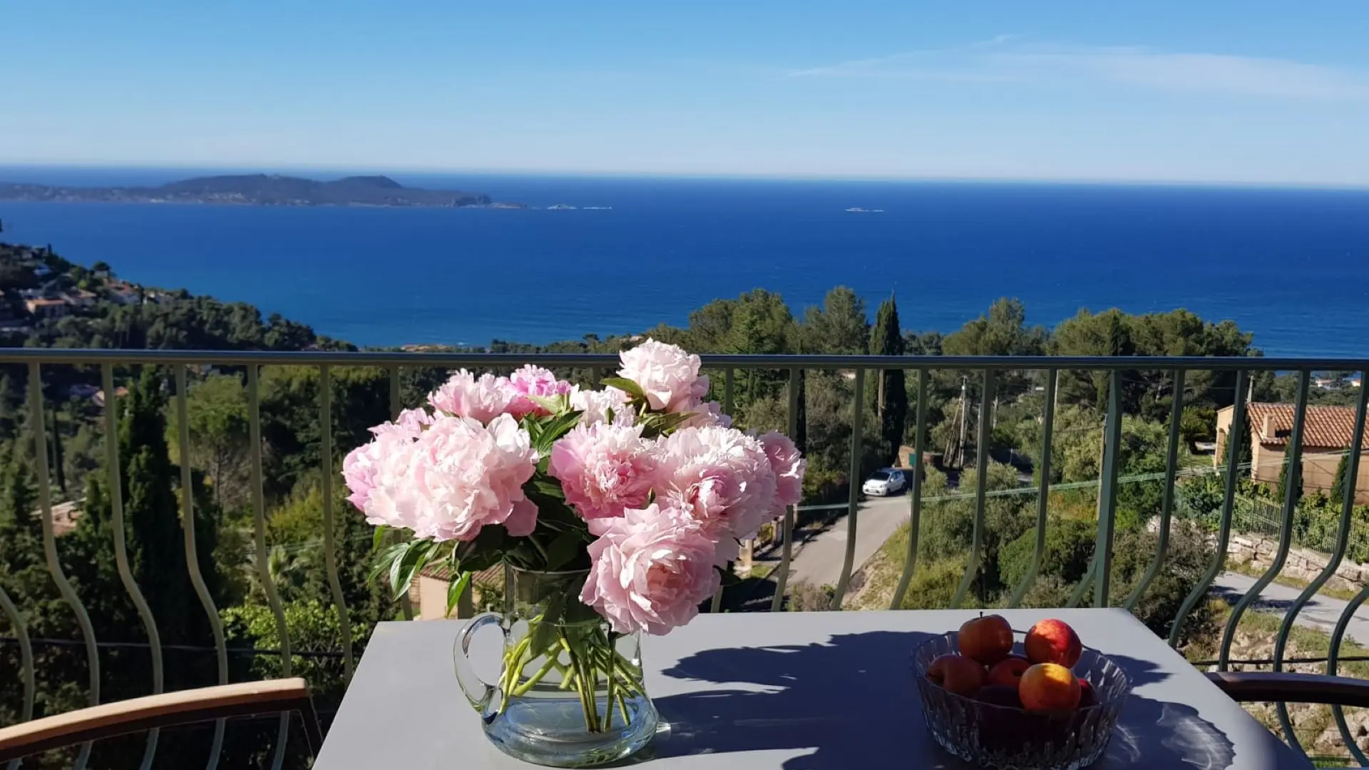 Garden apartment in villa, 180° panoramic sea view, T2 with terrace + 1 covered balcony 16M2 + private west garden, furnished. Label Gîtes de France, very quiet in private grounds. Staircase access to garden. The 1st floor is occupied by 1 person. Wifi, air conditioning.