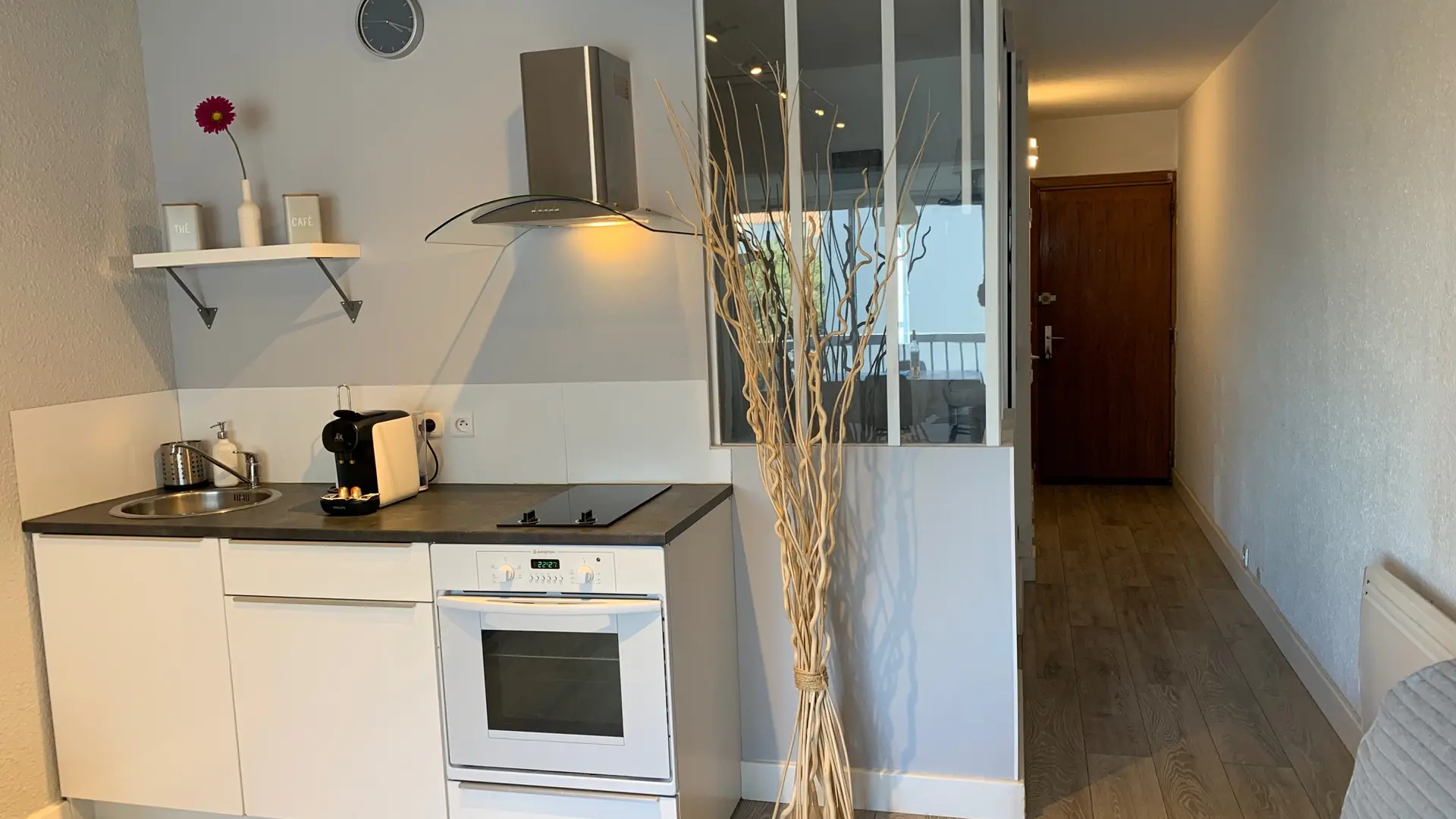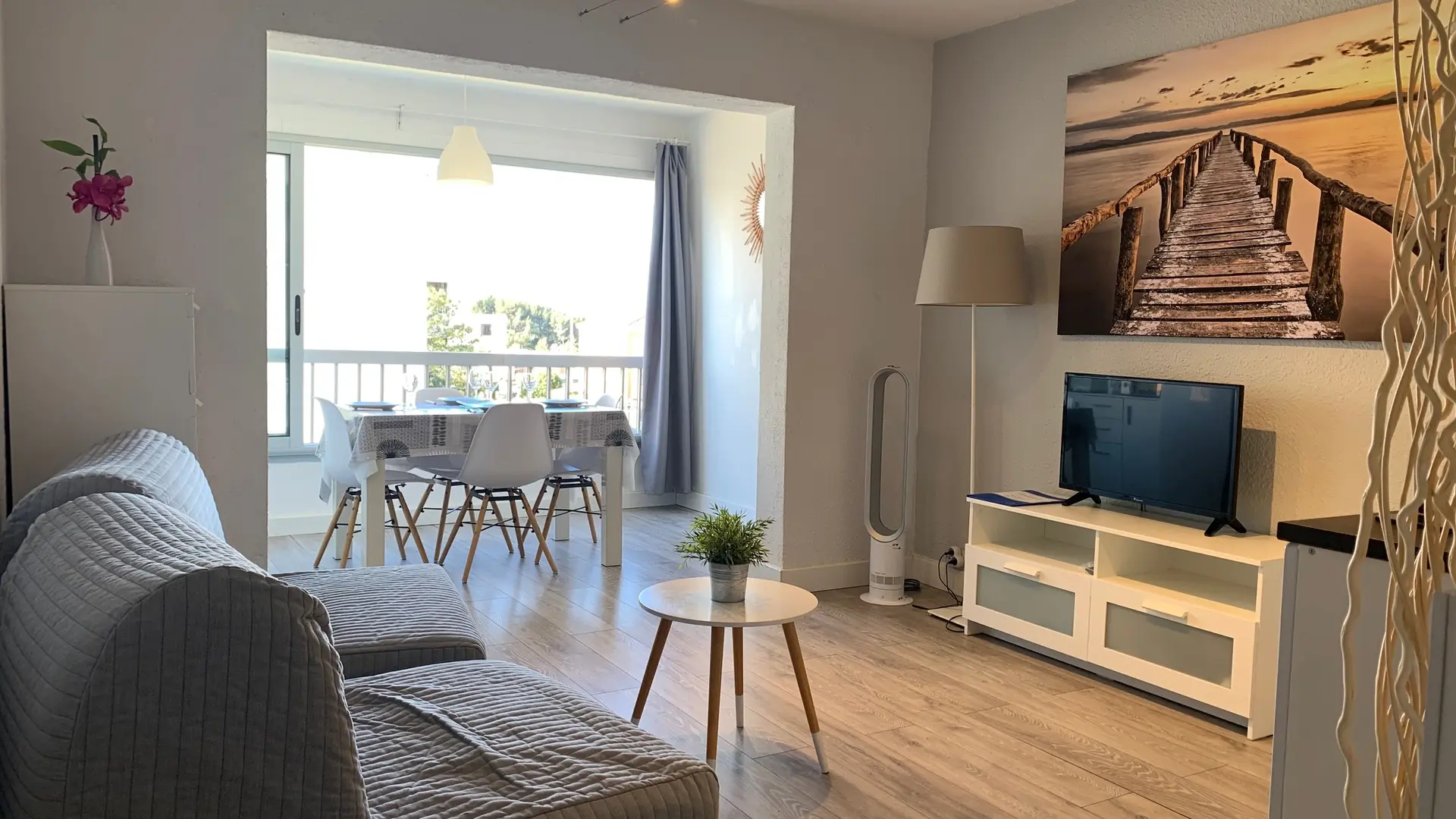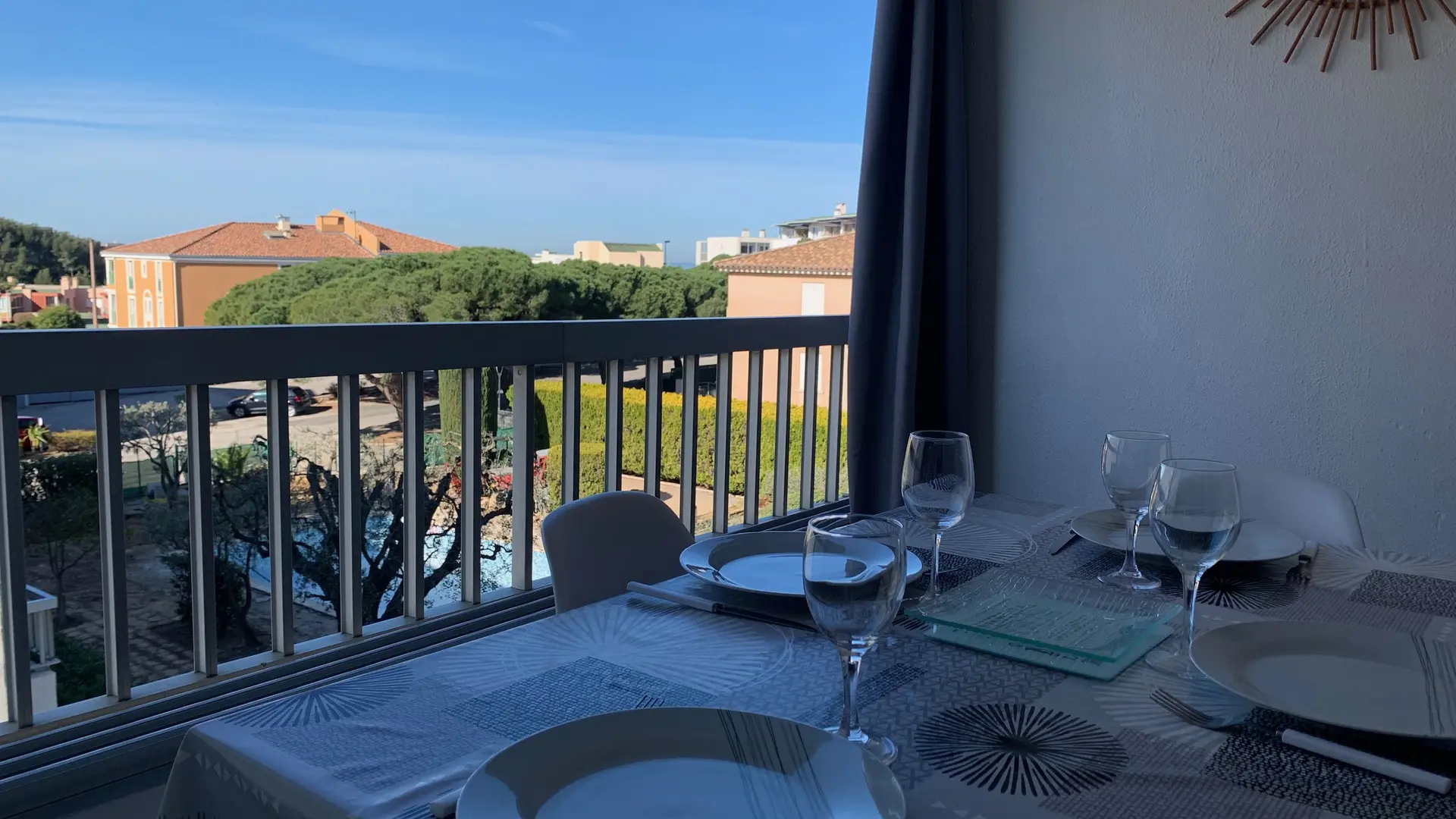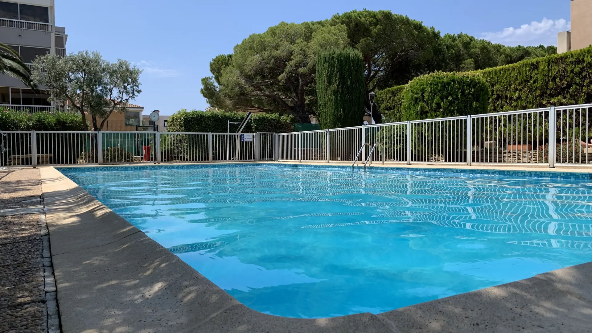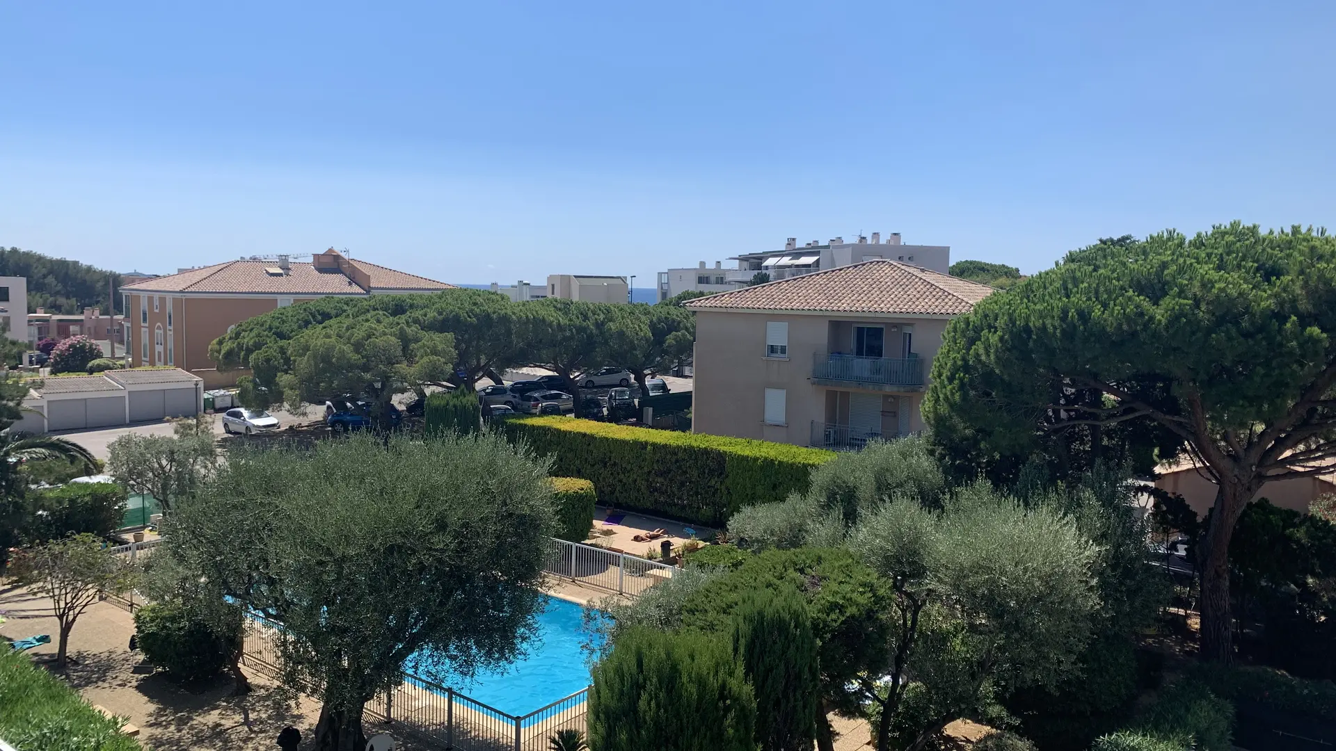 The apartment, classified by the Tourist Office with 2 stars, has a surface area of 38 m2, air conditioning (mobile air conditioner) and is located on the 3rd and top floor without an elevator, with a view of the swimming pool and a glimpse of the sea, and is not overlooked. It comprises :