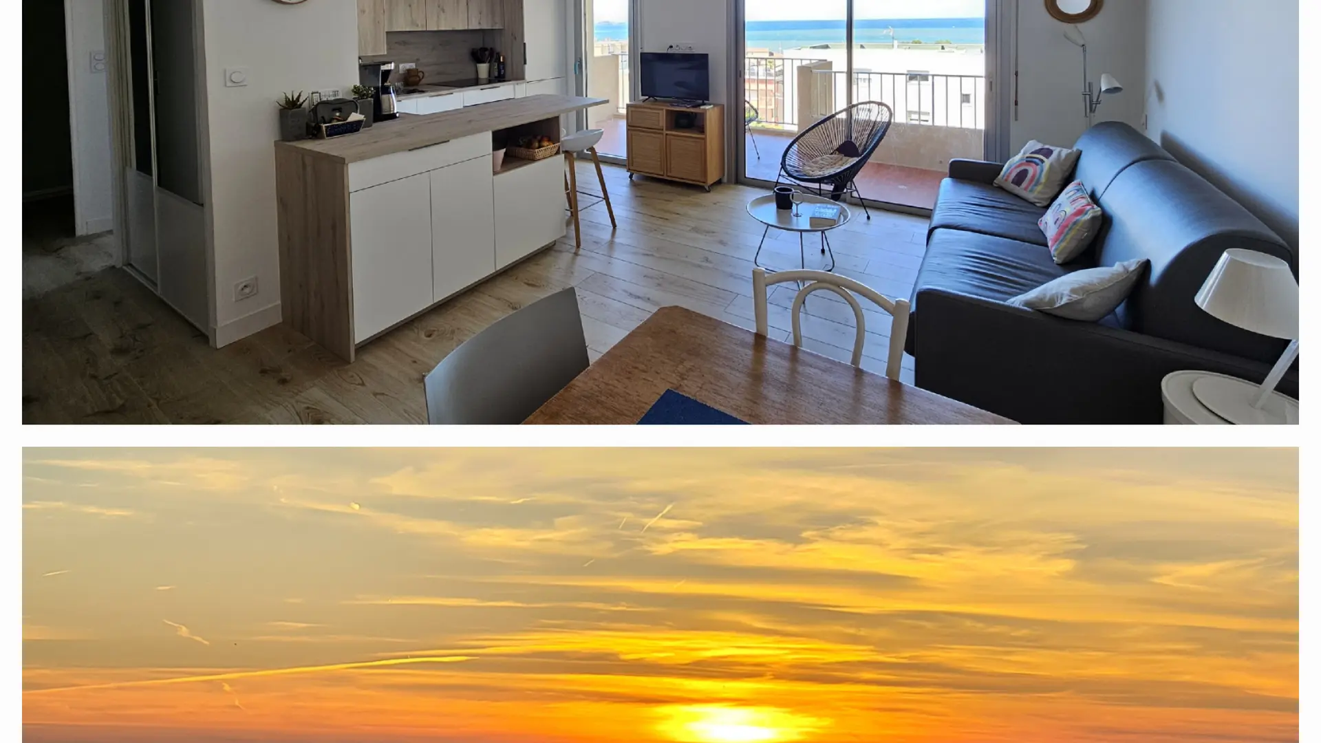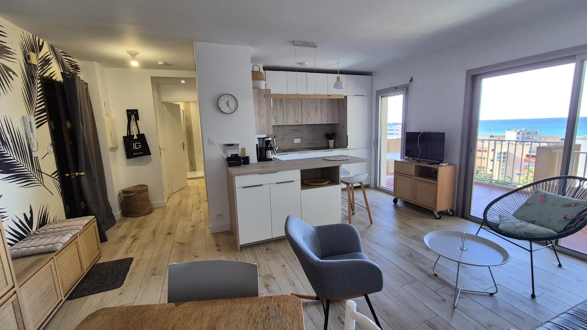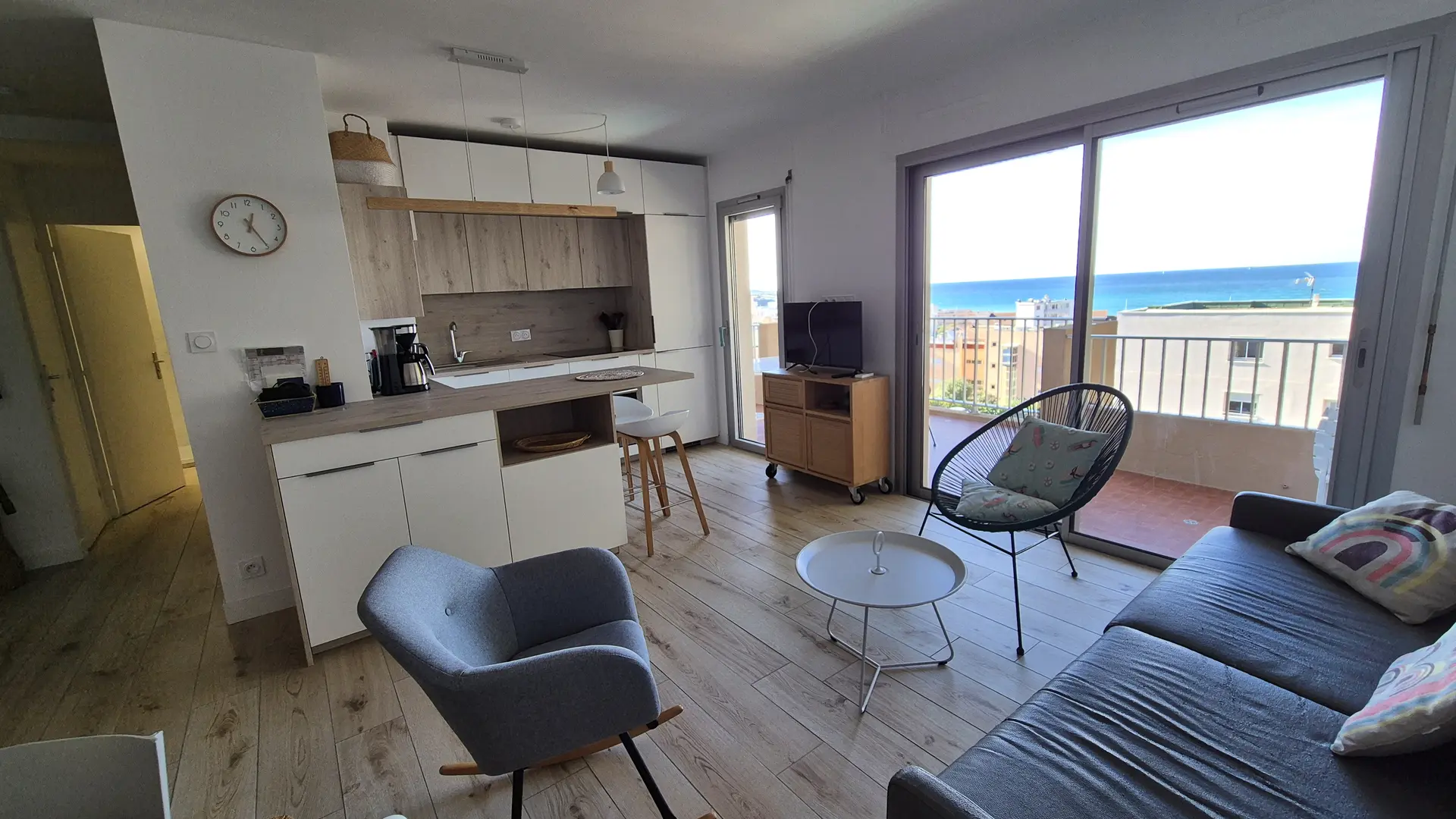 - a living room (lounge/kitchen) of approx. 28m2, with access to the panoramic sea-view terrace. The lounge area features a sofa bed (160x200); the kitchen area is fully equipped with plenty of storage space and an island, ideal for a 2-person lunch by the sea.