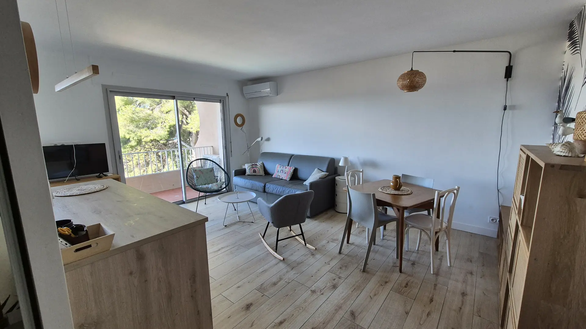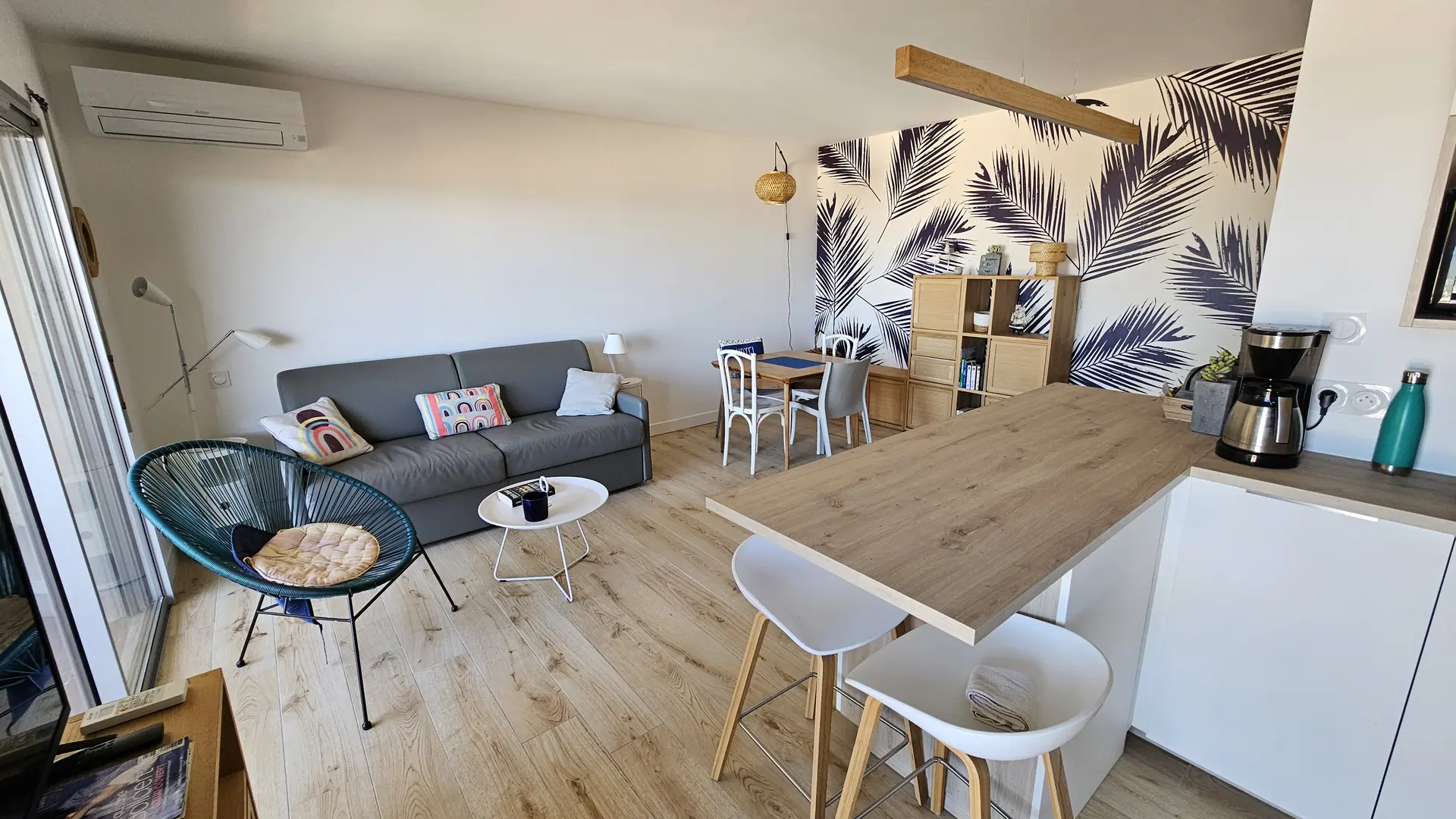 Fridge-freezer, dishwasher, oven, microwave, induction hob, hood, central island with breakfast nook, Nespresso coffee maker, filter coffee maker, kettle, toaster, blender, mixer, mini chopper, washing machine, hair dryer, Smart TV HD, reversible air conditioning, iron and ironing board.