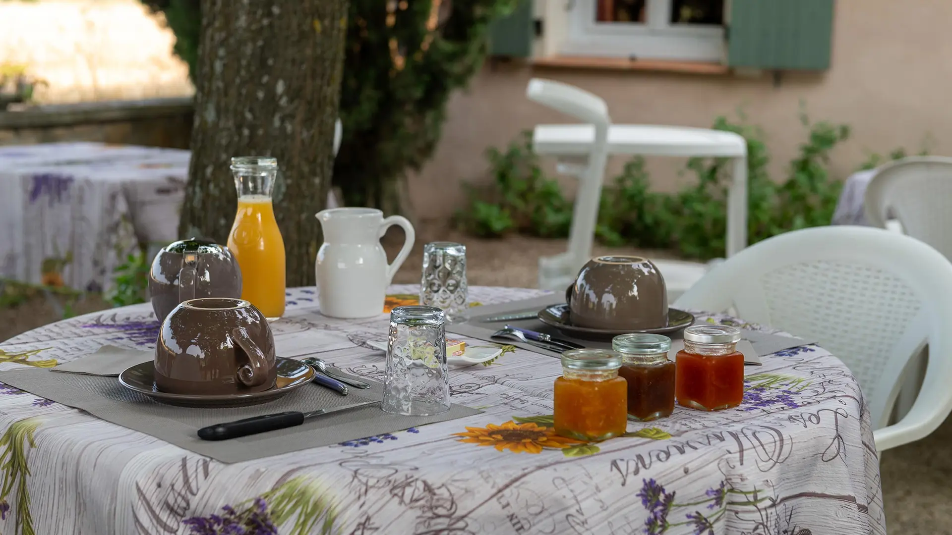An old farm with a shady courtyard, among lavender fields and vineyards.