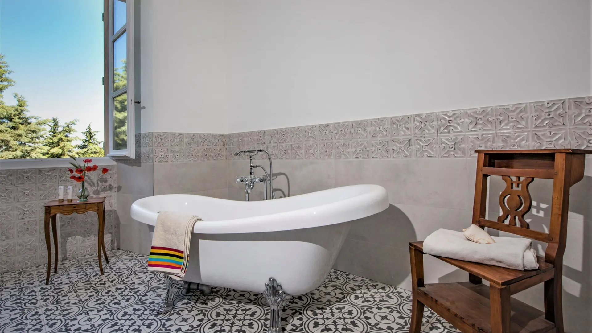 Alissa and Cédric welcome you to their château in Provence. The château offers 4 double en suite rooms for up to 9 guests. Each suite has its own private lounge and bathroom with large Italian shower, toilet, towel dryer and hairdryer.