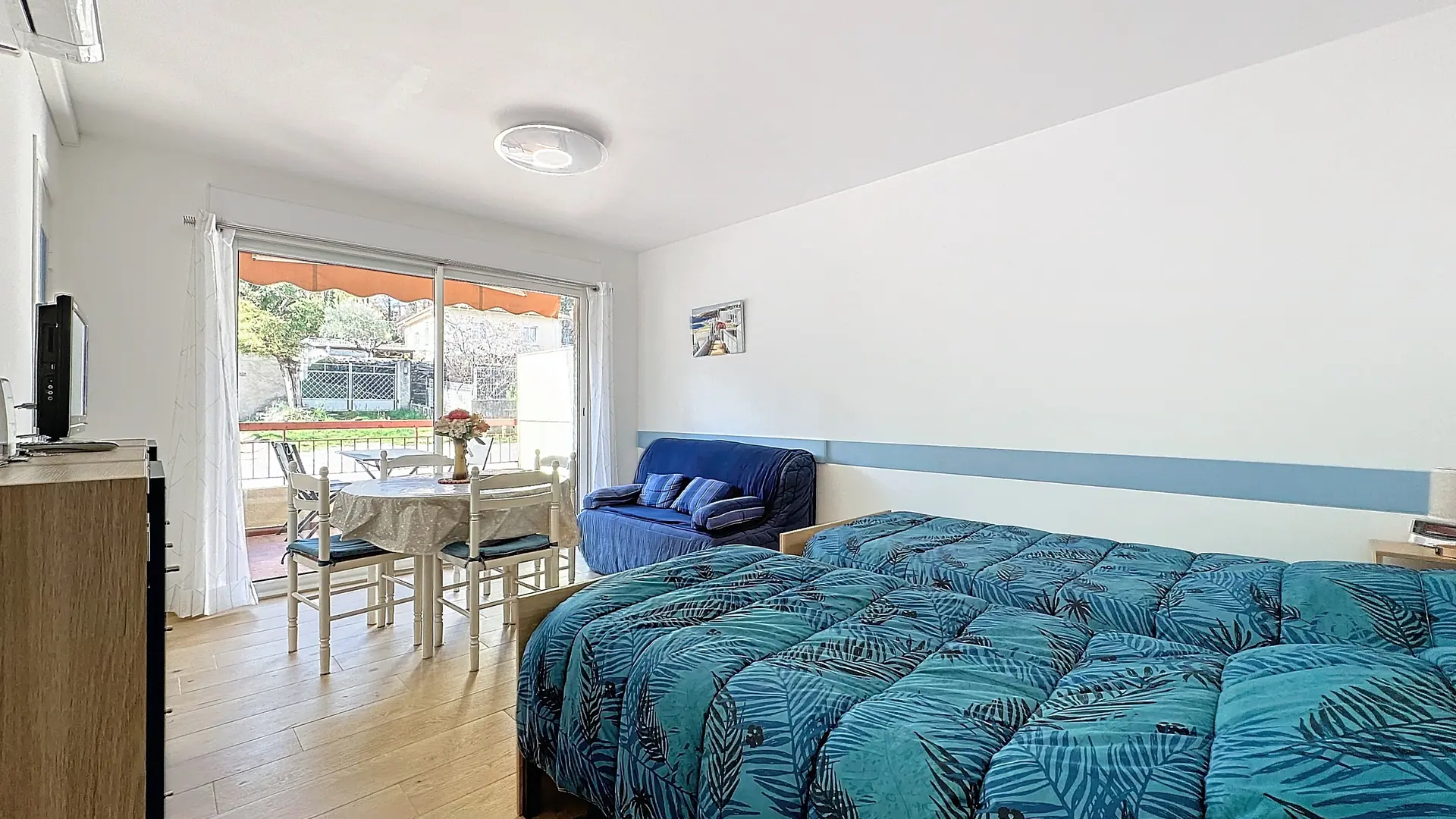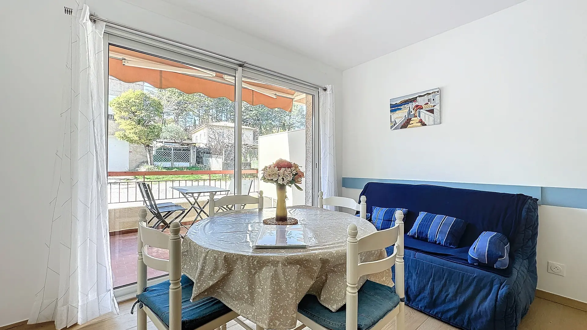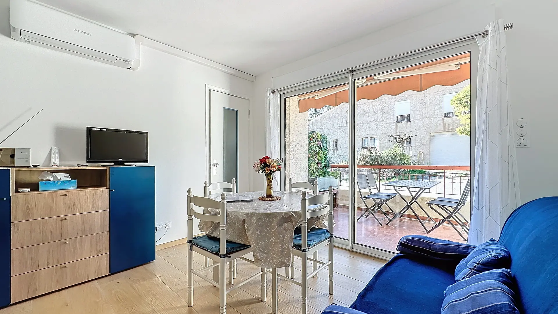 Enjoy an air-conditioned apartment with a shaded terrace, outdoor dining set and private parking.