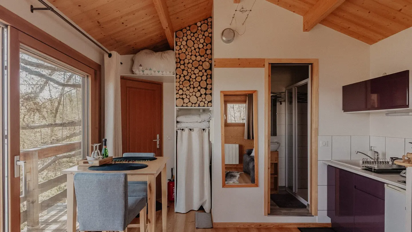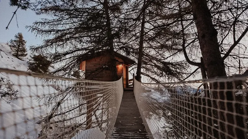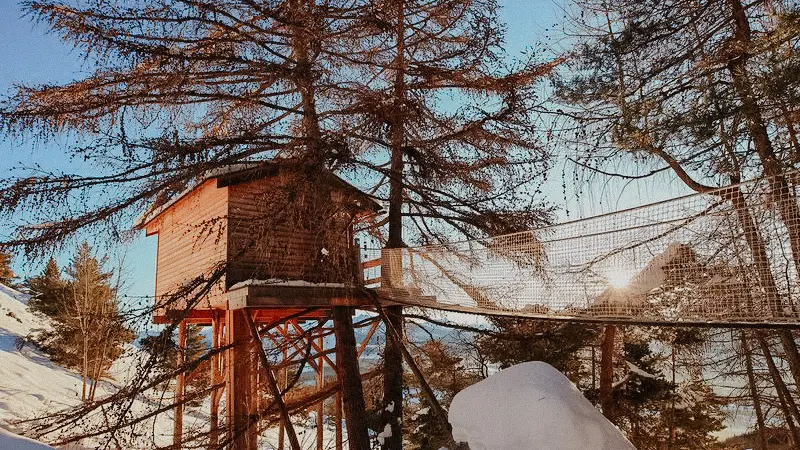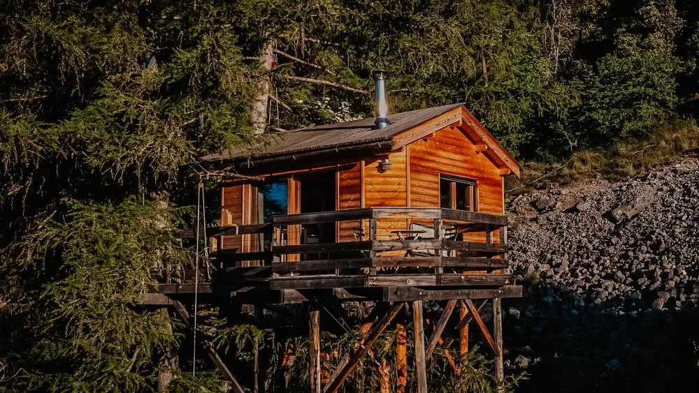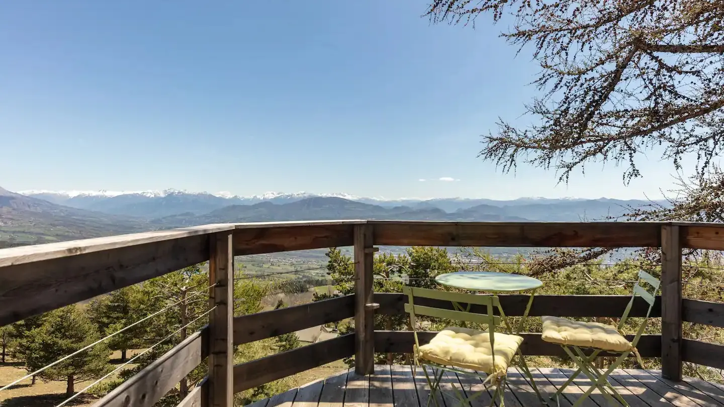 Hut at 6 meters from the ground, at 1500m of altitude with panoramic terrace. Accessible via a secure suspended footbridge (22 m). Elements of comfort : bathroom, WC, kitchenette, wood stove, convector heater, sofa bed for 2 persons. Towels and sheets provided. Breakfast served "à la poulie". Firewood at disposal. Ideally located above the Col Bayard and 15 minutes from Gap.