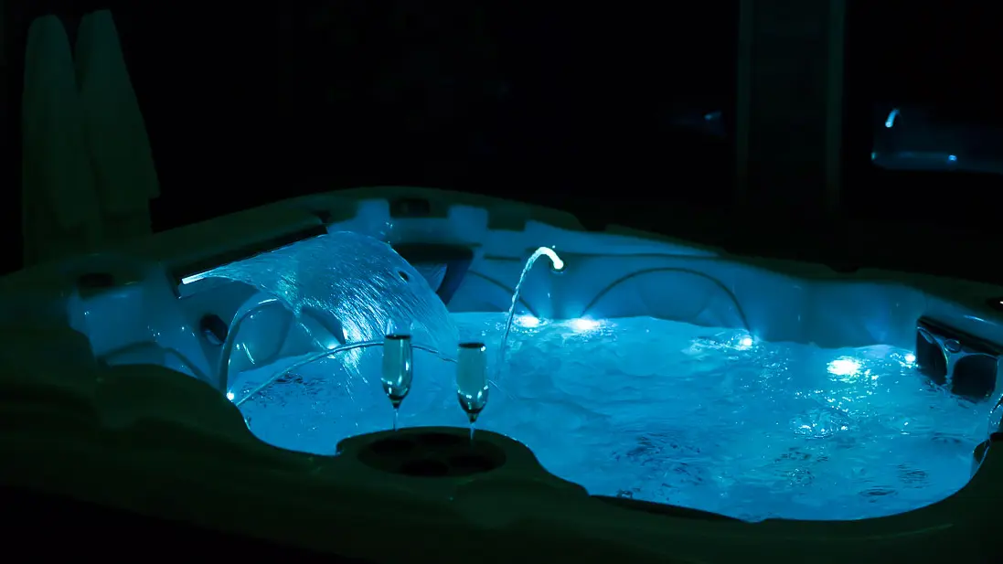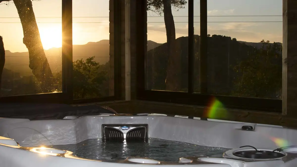 The 25m2 room is fully air-conditioned, with a private 15m² covered, enclosed terrace, heated in winter, and a Jacuzzi with 5 different massage zones and a waterfall.