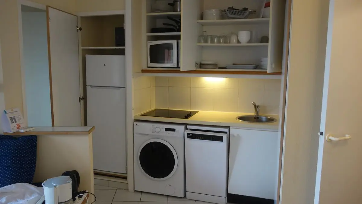 Fully-equipped kitchen with dishwasher, washing machine, refrigerator with freezer compartment, hob and microwave grill.