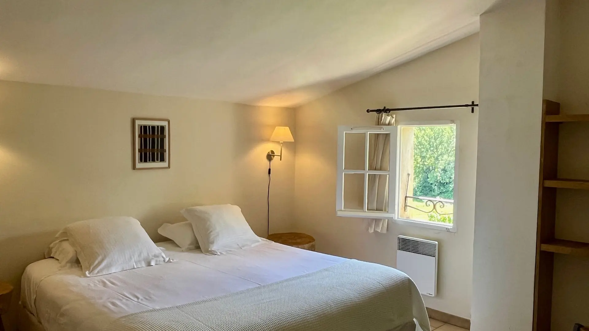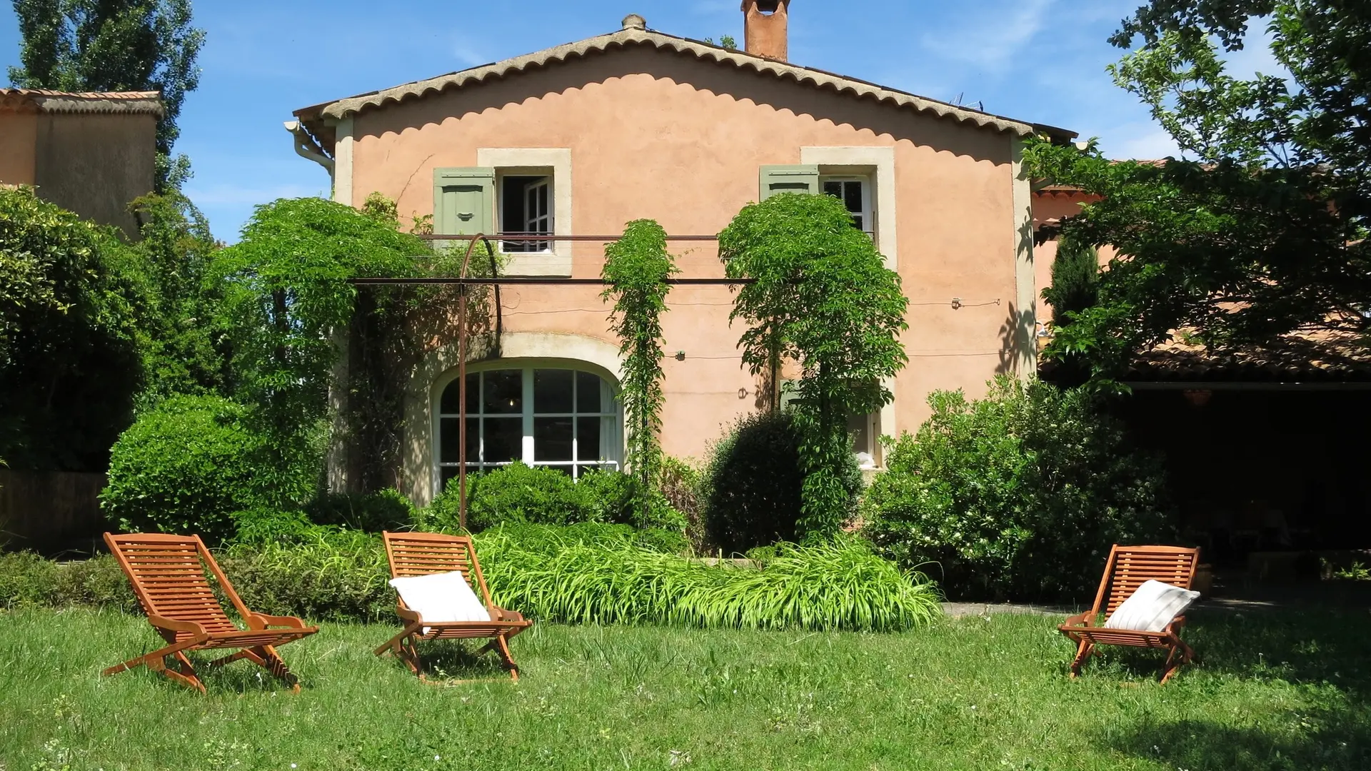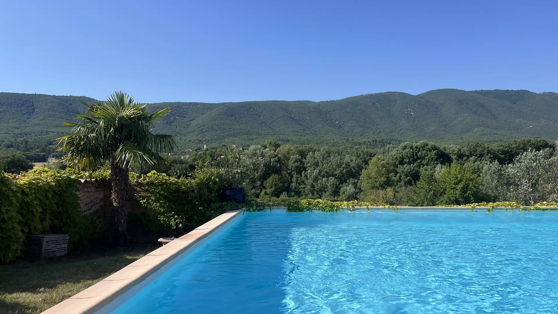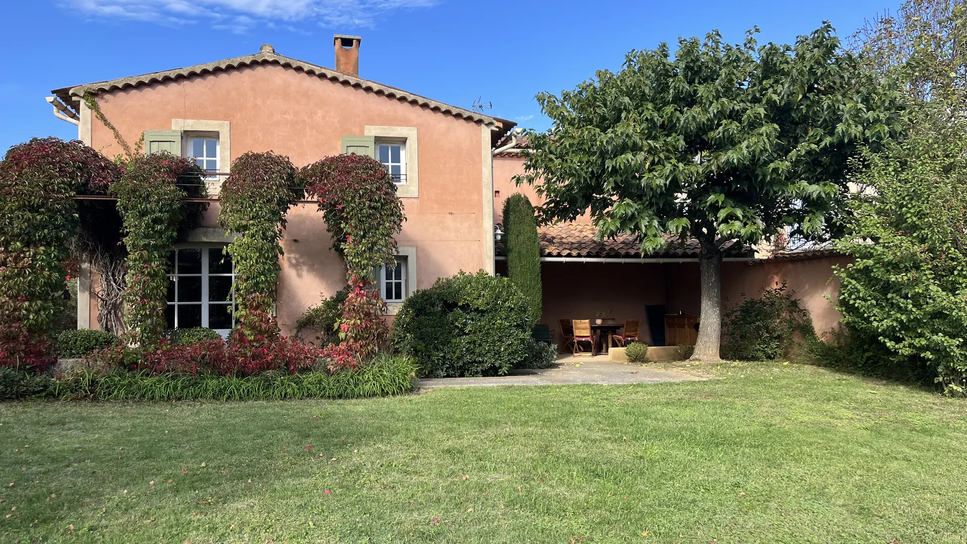 In the countryside, in a 5 hectares very quiet estate : charming farmhouse, facing south and the Grand Luberon. Private garden with trees, summer terrace. 12x8m pool to shard with 2 other mas. Very quiet. Air-conditioned rooms.