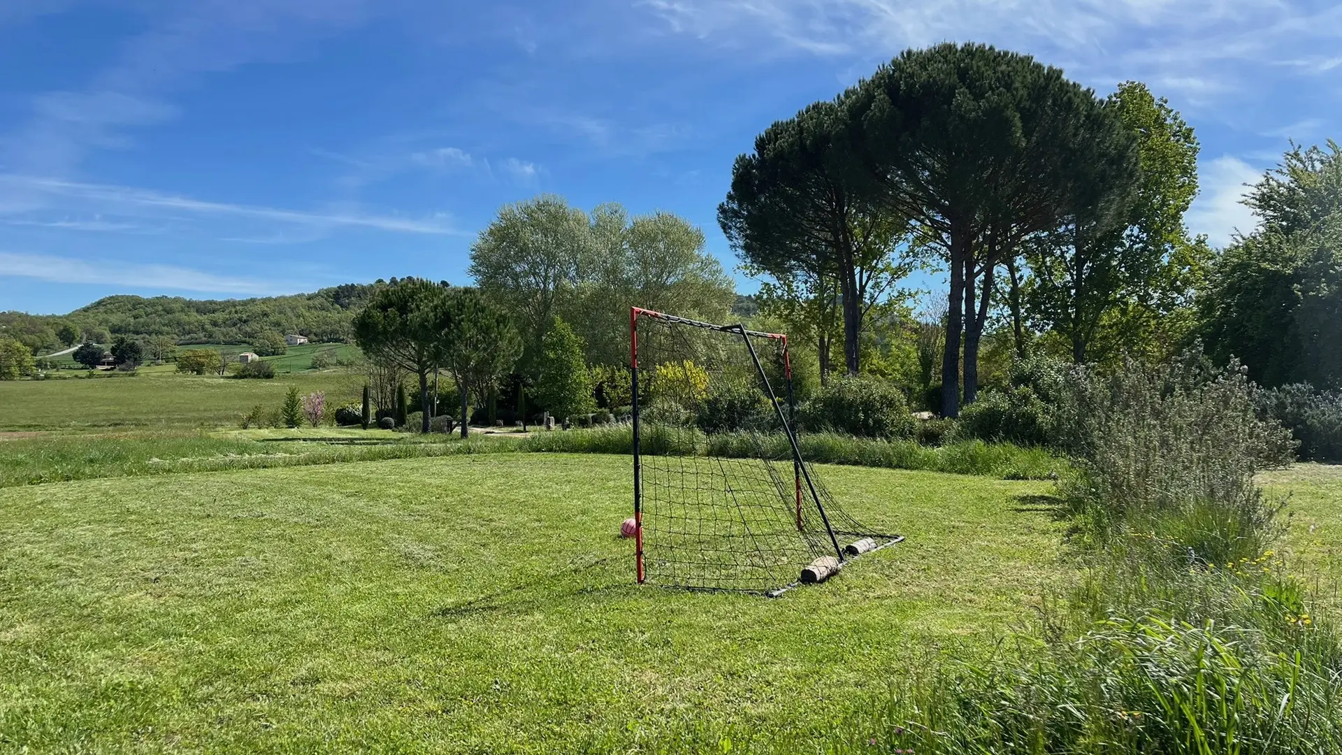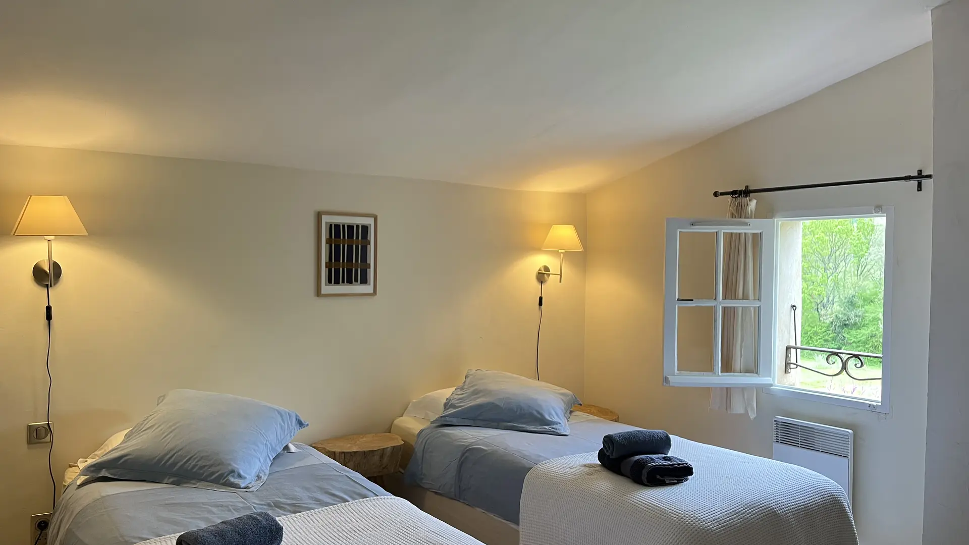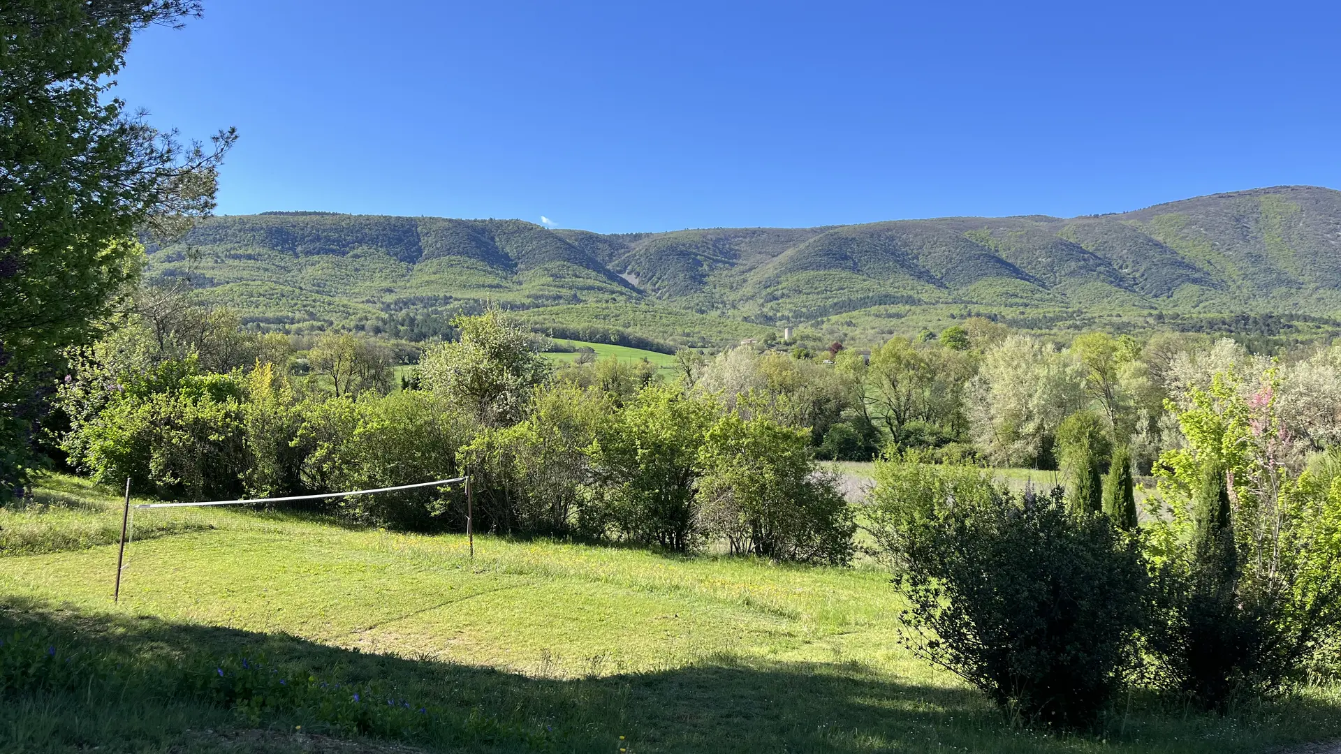 In the countryside, in a 5 hectares very quiet estate : charming farmhouse, facing south and the Grand Luberon. Private garden with trees, summer terrace. 12x8m pool to shard with 2 other mas. Very quiet. Air-conditioned rooms.