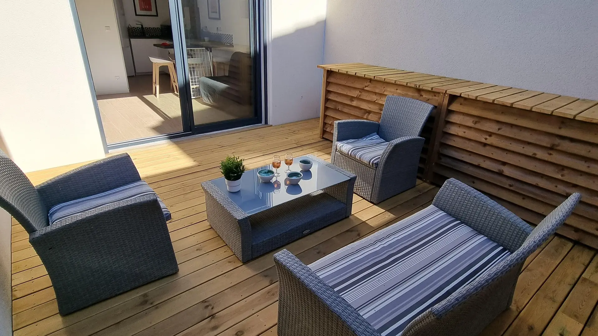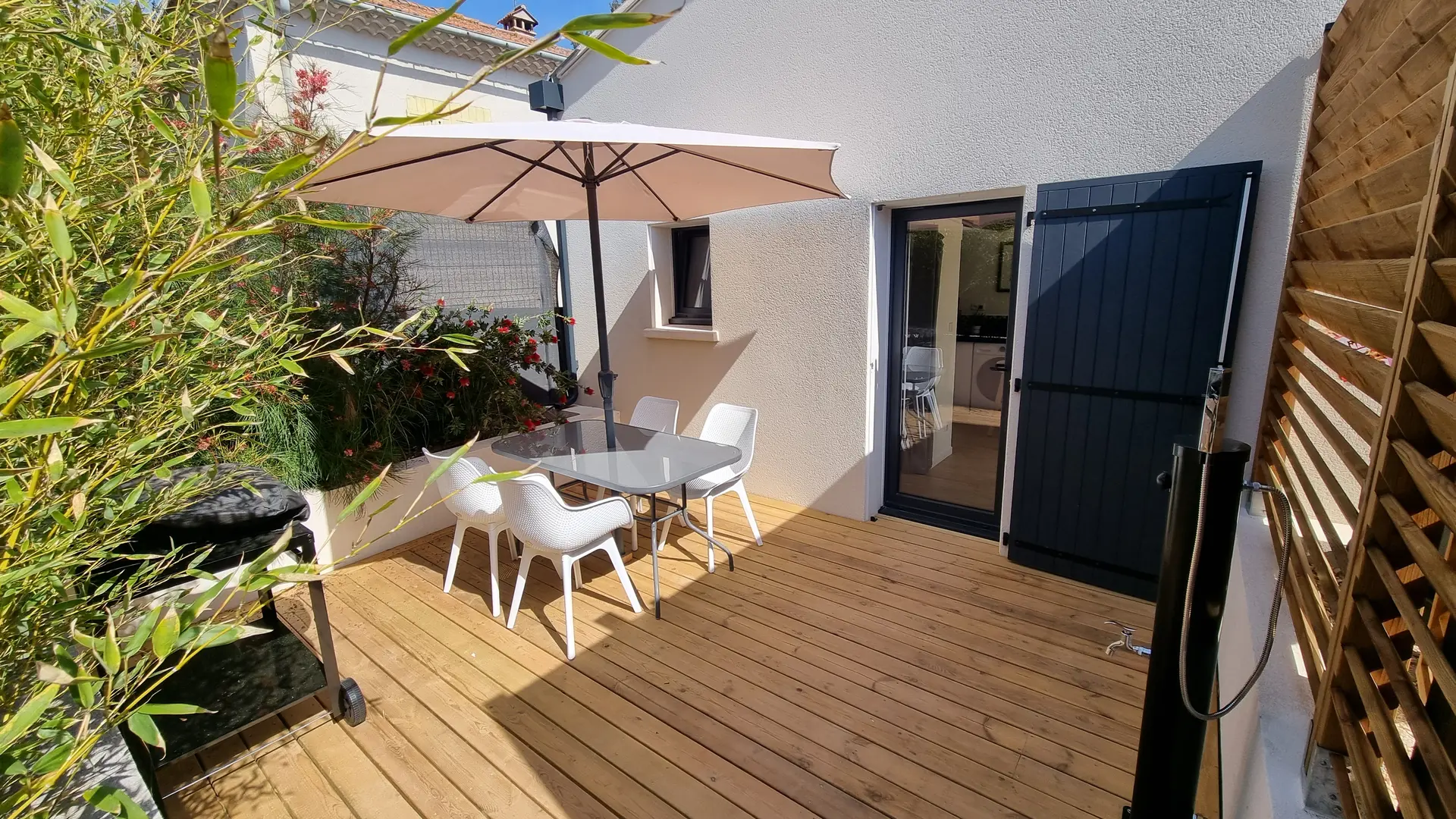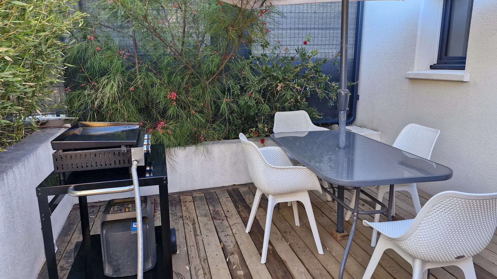Two private terraces, each measuring 15 m², quiet and not overlooked: garden furniture, table + 4 chairs, plancha grill, parasol and outdoor shower.