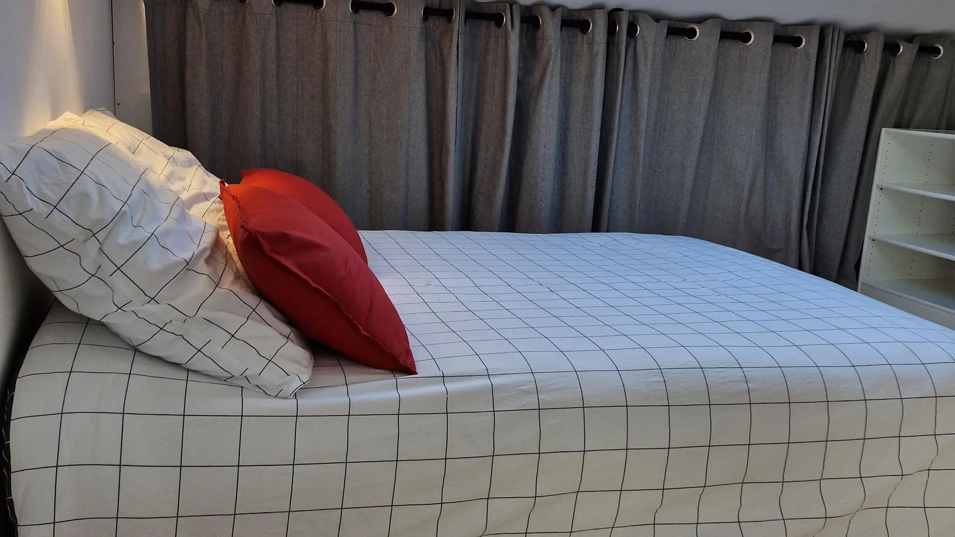 Mezzanine with double bed (140 cm) and plenty of storage space.