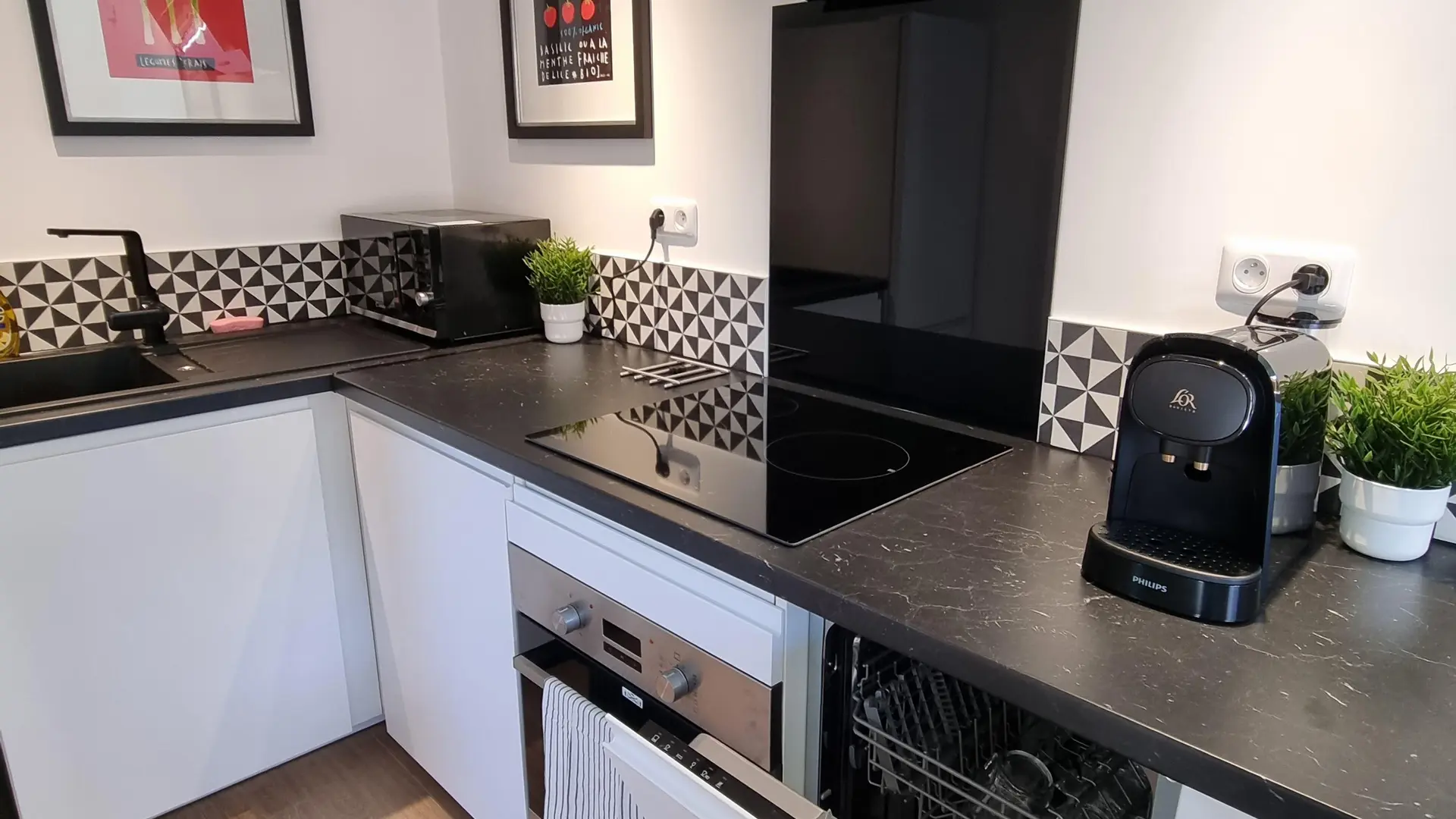 Bright living room: lounge area with sofa bed and TV, fully equipped kitchen (dishwasher, hob, oven, microwave, Nespresso coffee machine, fridge/freezer, washing machine).