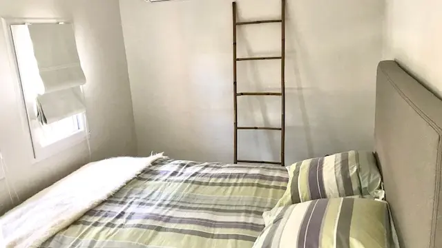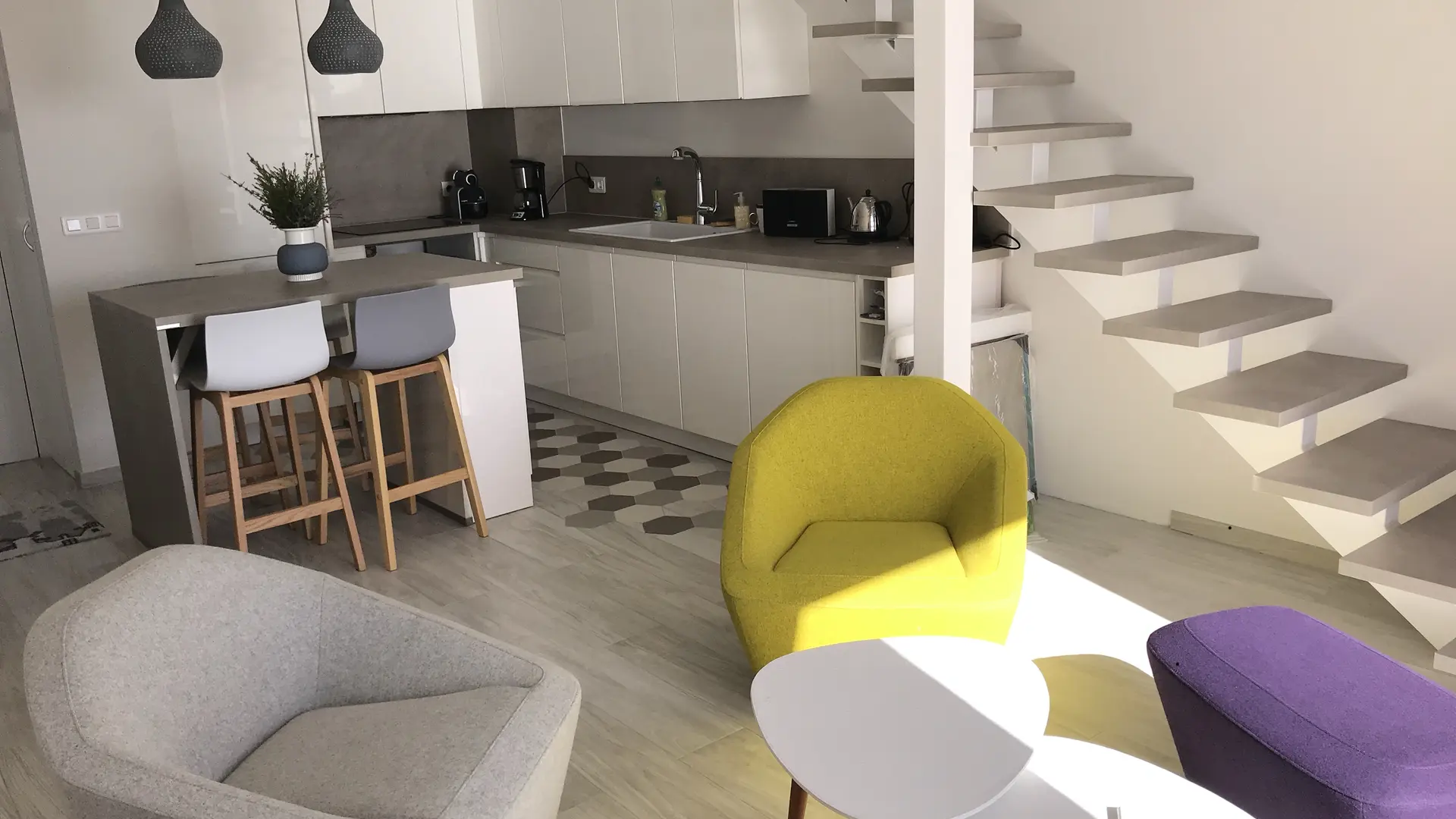 1 pull-out bed on the mezzanine equipped with high-quality bedding that can make 2 beds or a king-size bed (180x190). Fully equipped kitchen. Large-screen TV. Tumble dryer. Separate bathroom & WC. Washing machine and dryer