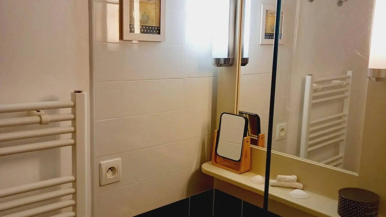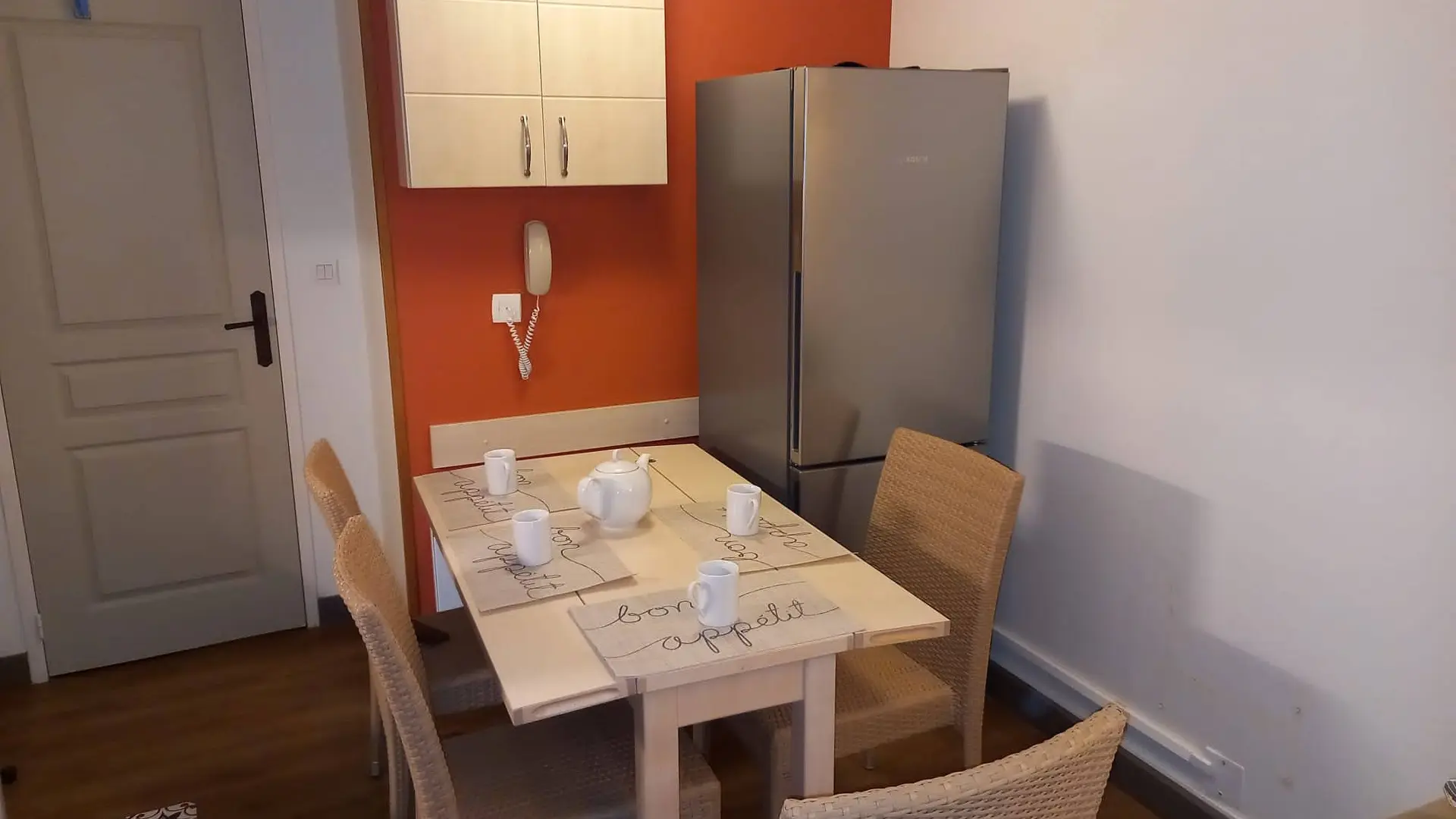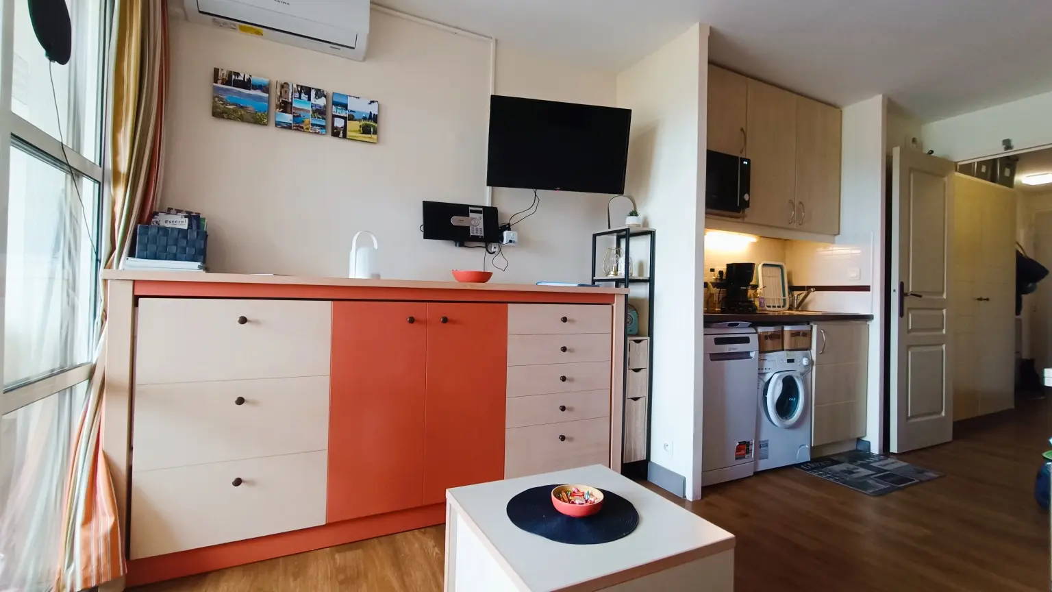 *Open-plan kitchen with appliances: dishwasher, washing machine, combined microwave/grill oven, large 3-drawer fridge-freezer, filter coffee machine, Nespresso capsules, kettle, ceramic hob and plenty of crockery. *Living room with sofa (+ pull-out bed = 2 beds 90X190cm), table with chest of drawers and fold-away bed (1 person), TV and radio.