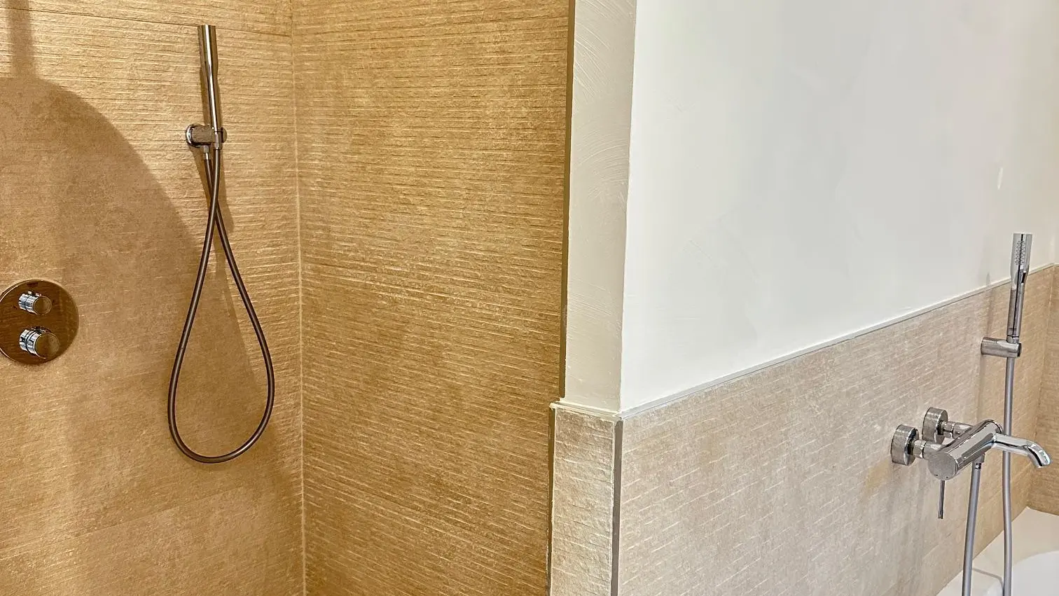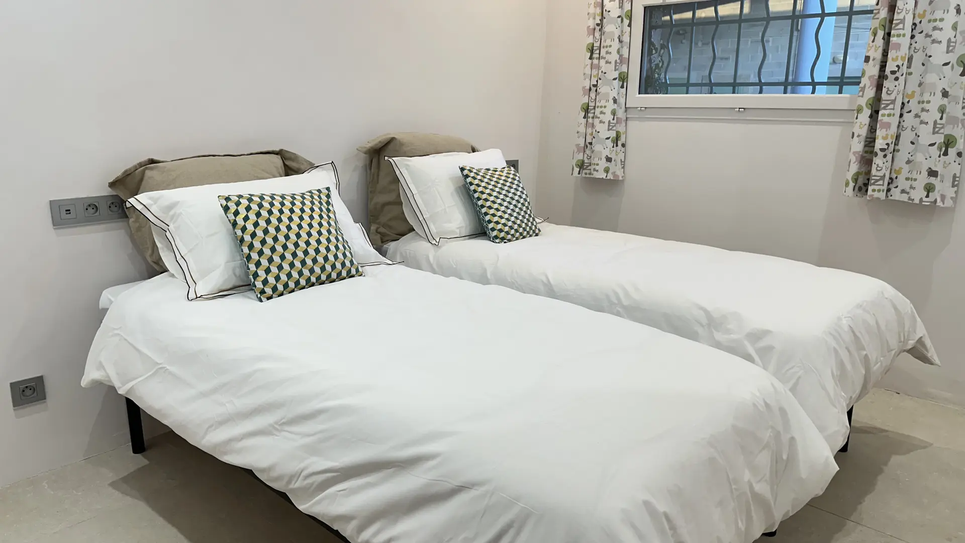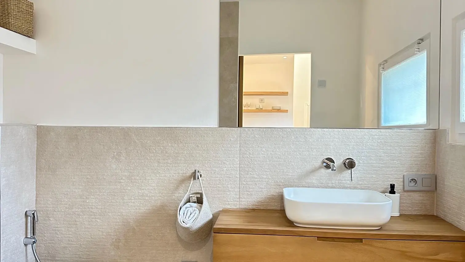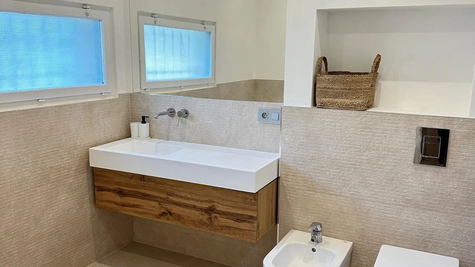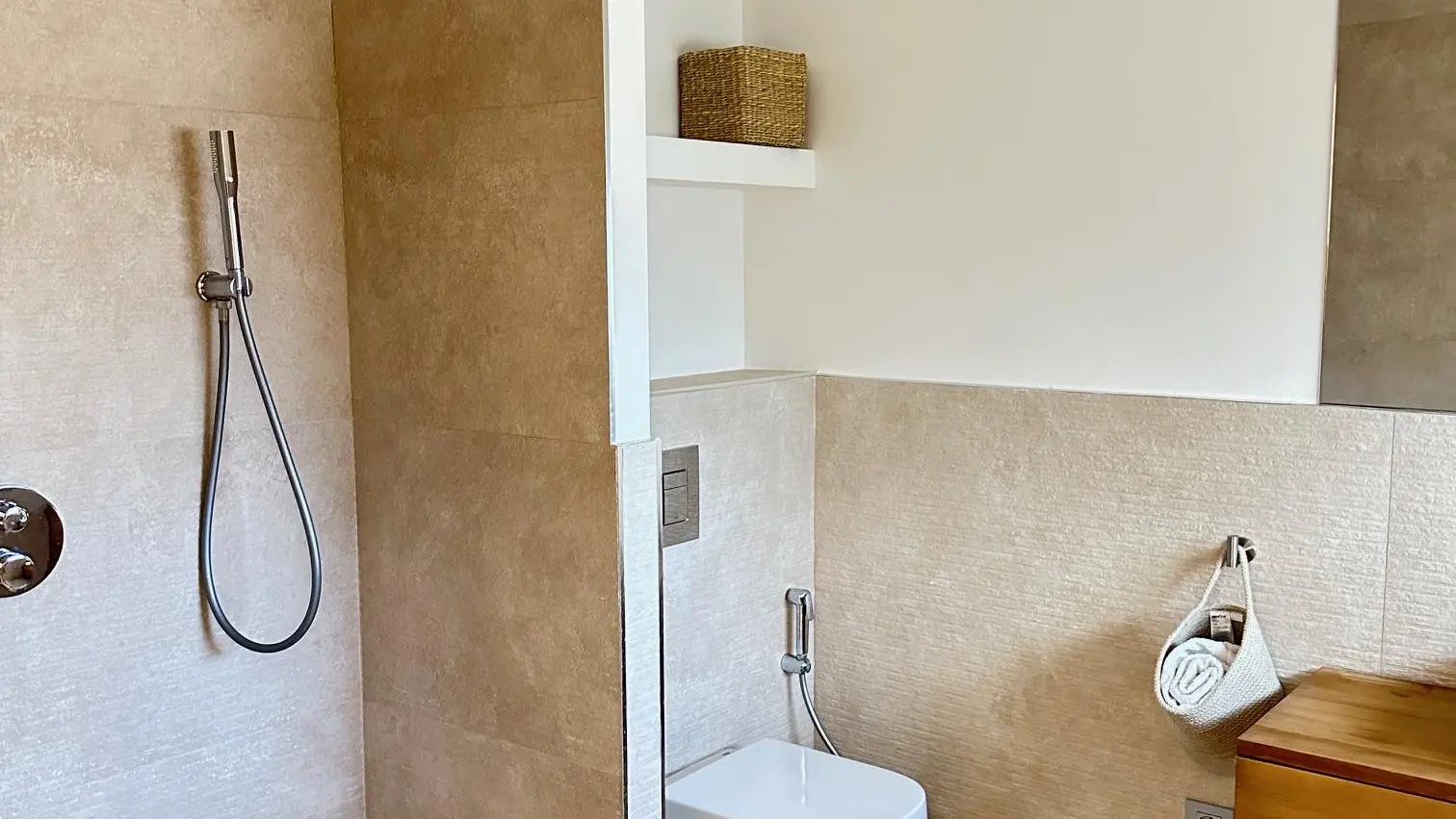 The two contemporary bathrooms add a touch of luxury, with one featuring both a bath and shower, while the other boasts a walk-in shower. Both bathrooms are equipped with bidets for added convenience and comfort.