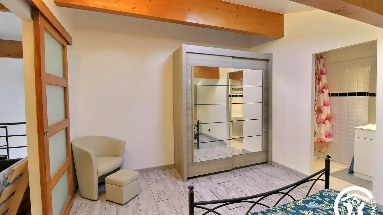 - Bedroom with a 140x190cm bed, armchair, and wardrobe.