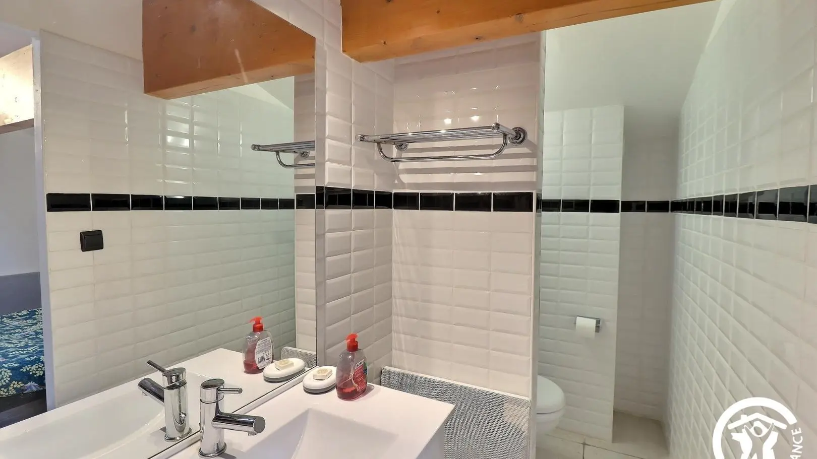 - Private bathroom in the upstairs bedroom, shower with curtain, sink, towel rack, and toilet.