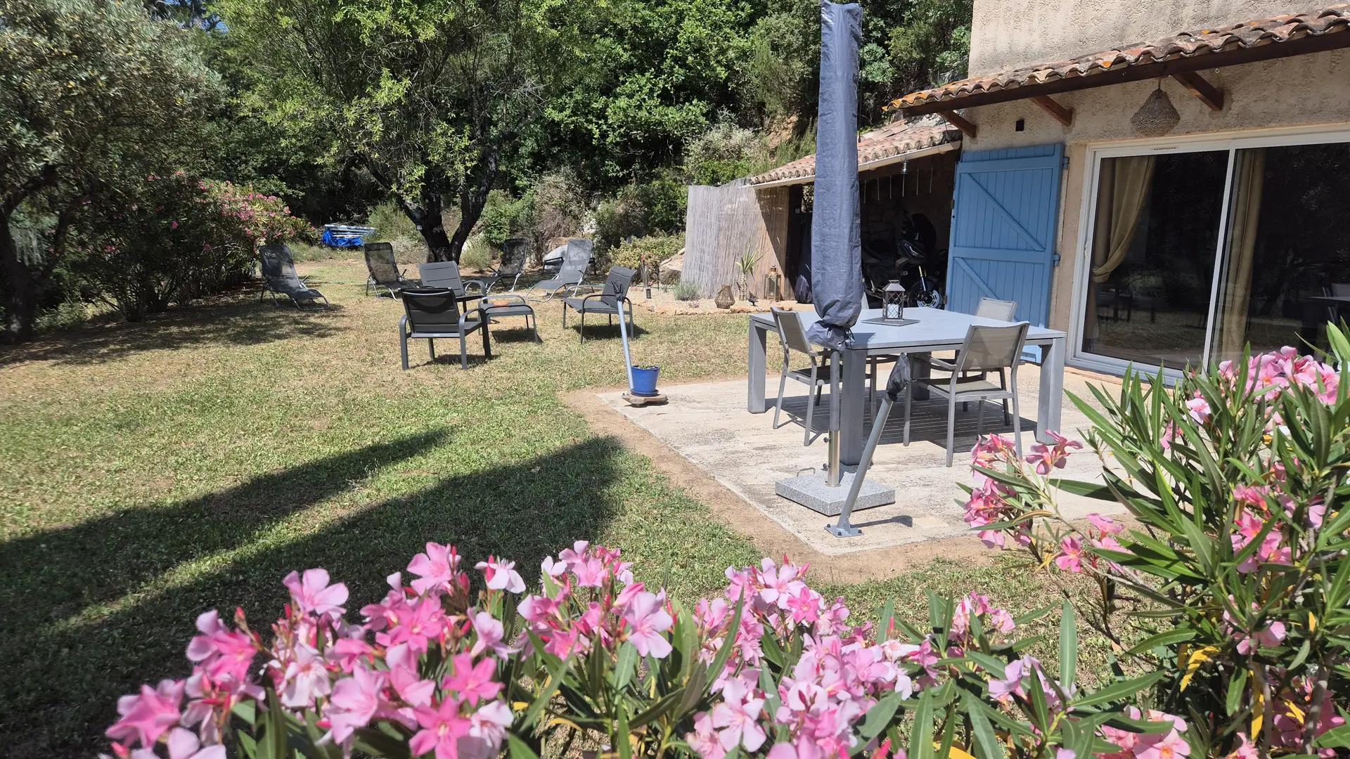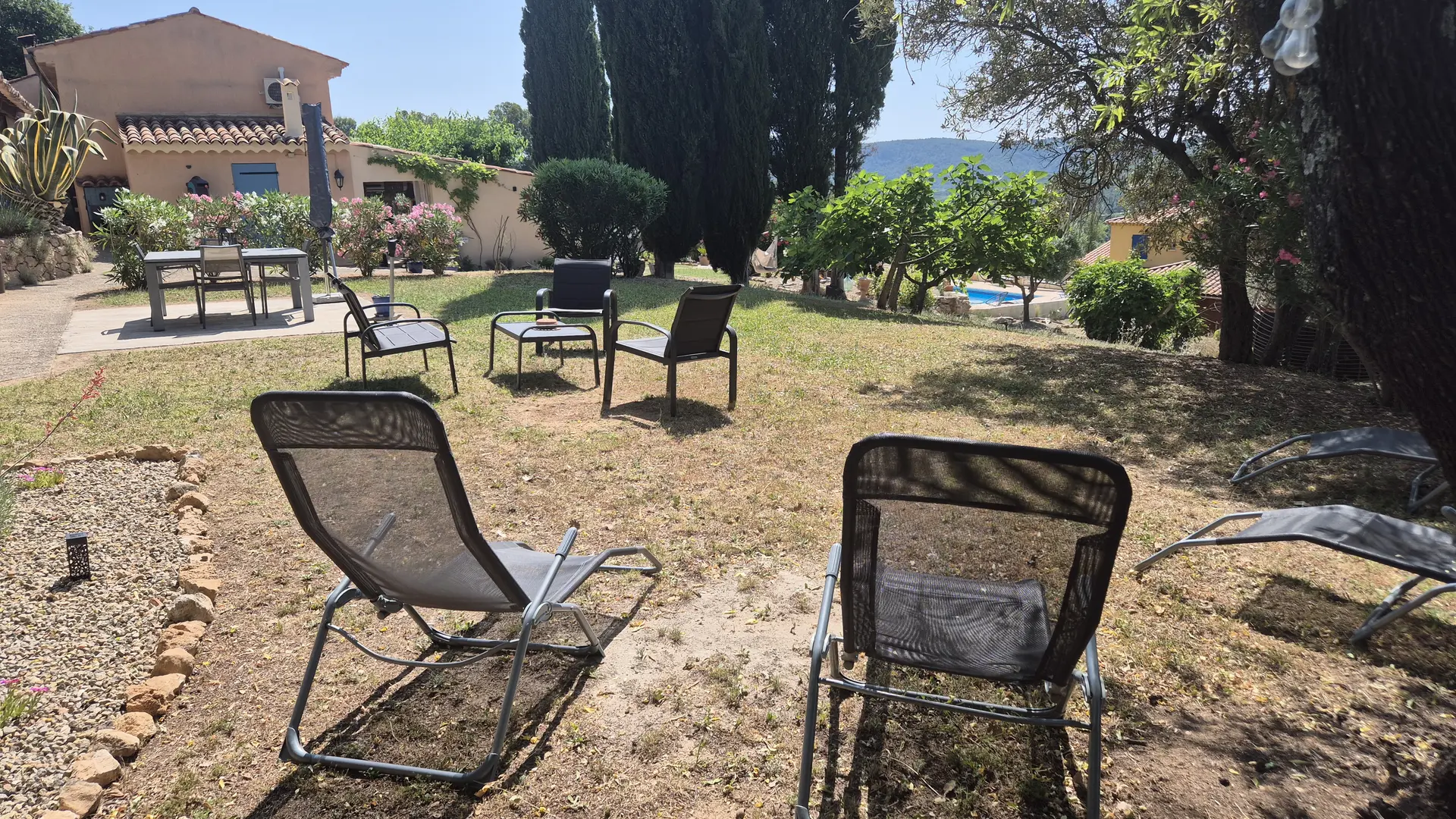 Guests have access to a private, shaded adjoining terrace with a beautiful view over the valley. Also available: fitness equipment, garden, pétanque court, and direct access to the swimming pool.