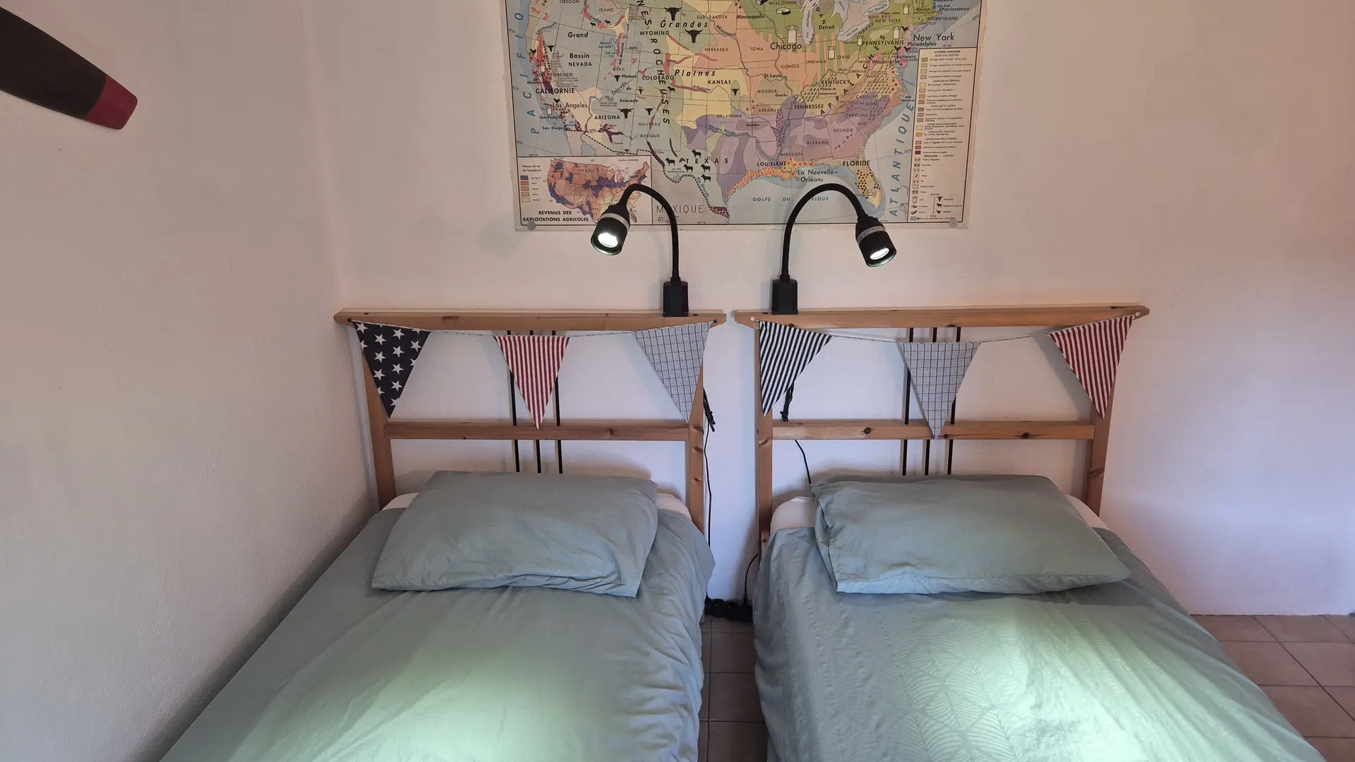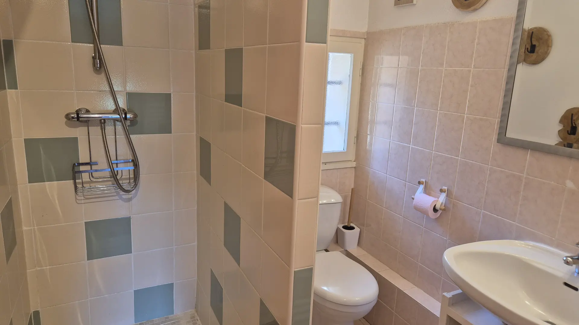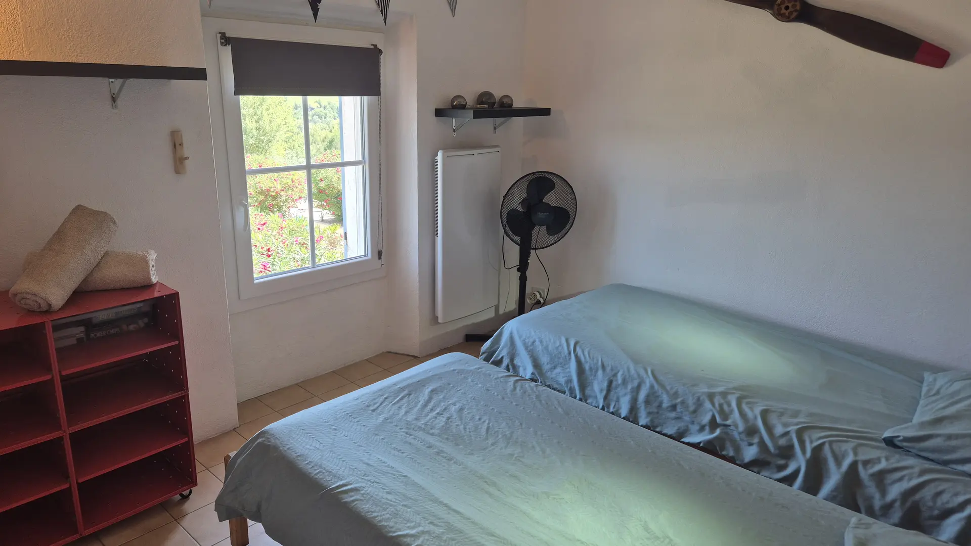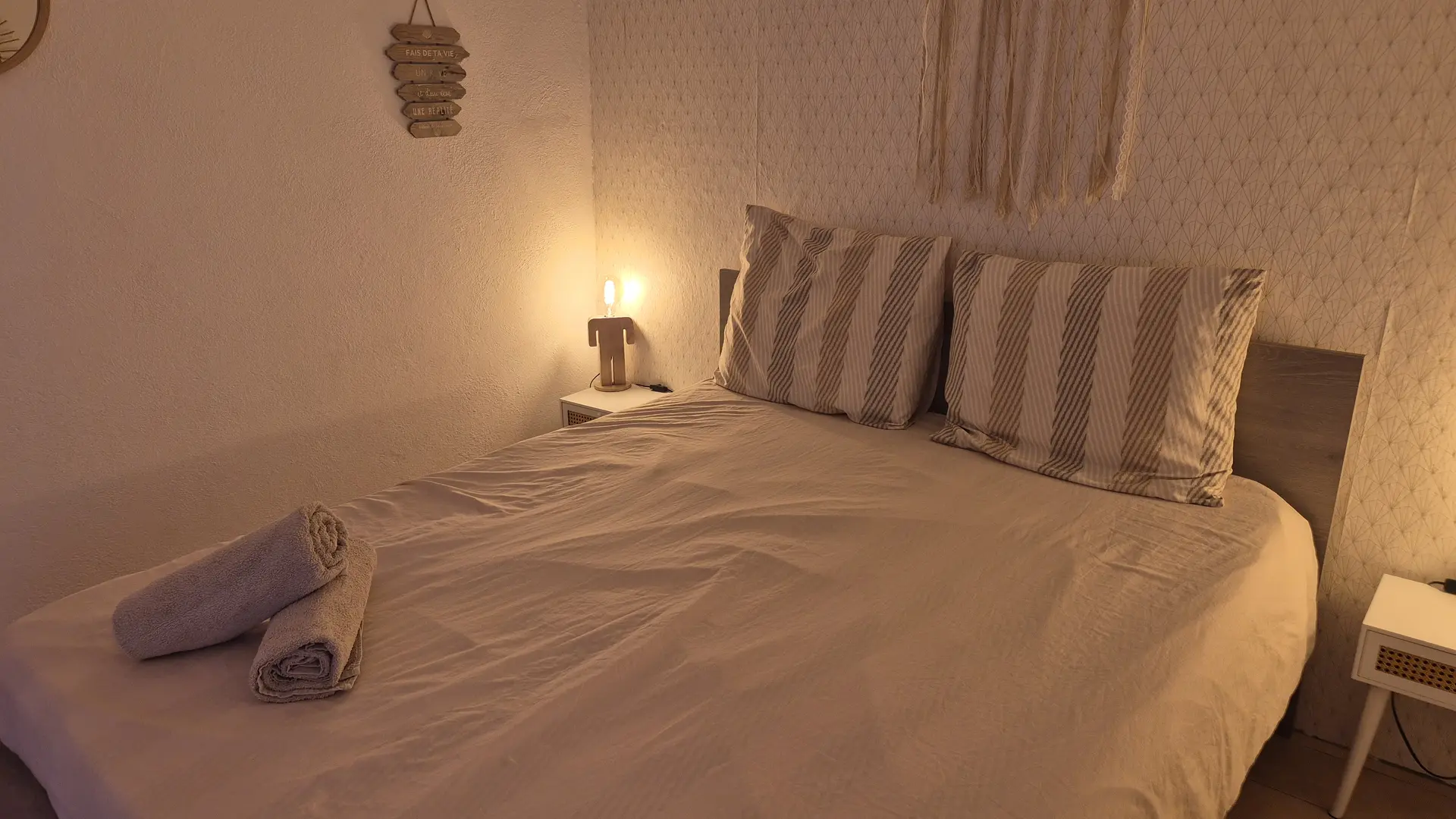 58 m² apartment, air-conditioned, furnished and equipped. Open-plan kitchen and living area with sofa bed, coffee table, and dining table. Two bedrooms: one with a double bed, the other with two single beds. Shower room and toilet. Furnished rooftop terrace.