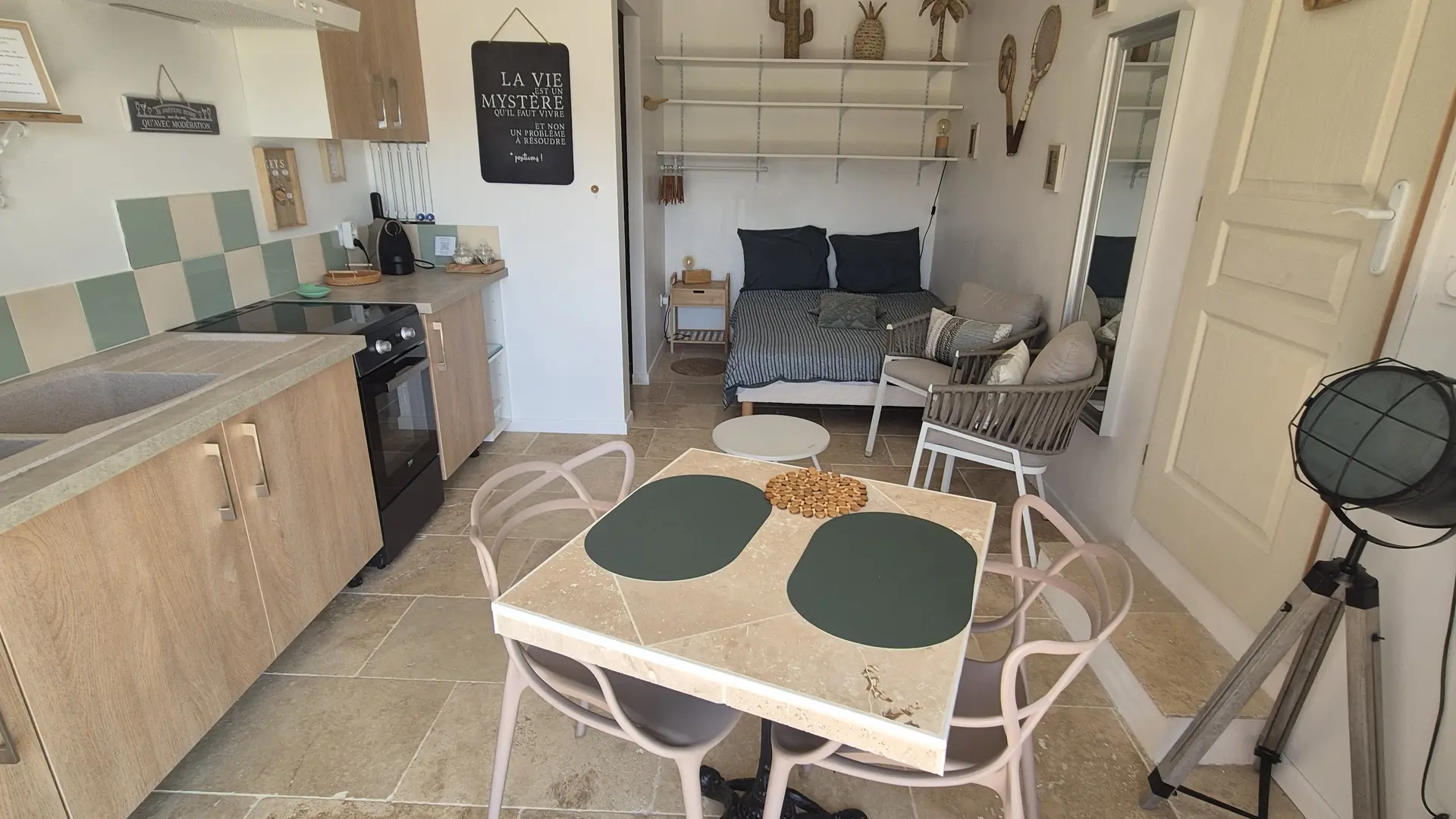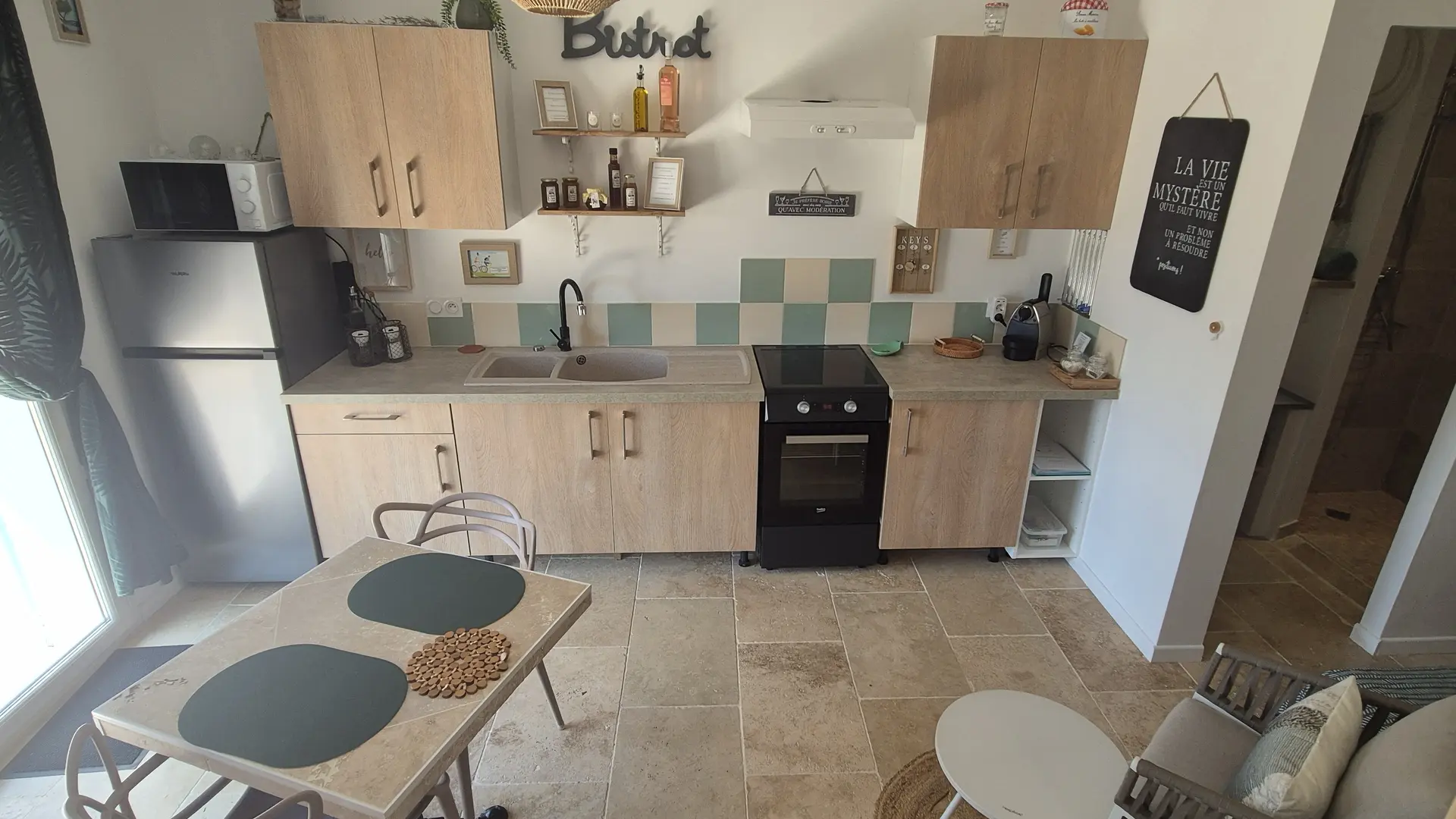 20 m² cottage, thoughtfully arranged to combine comfort and functionality. It features an open-plan kitchen connected to a bright living area, a double bed, an independent shower room, and separate toilets. The living space also includes a dining table with two chairs and two armchairs with a coffee table for relaxation.