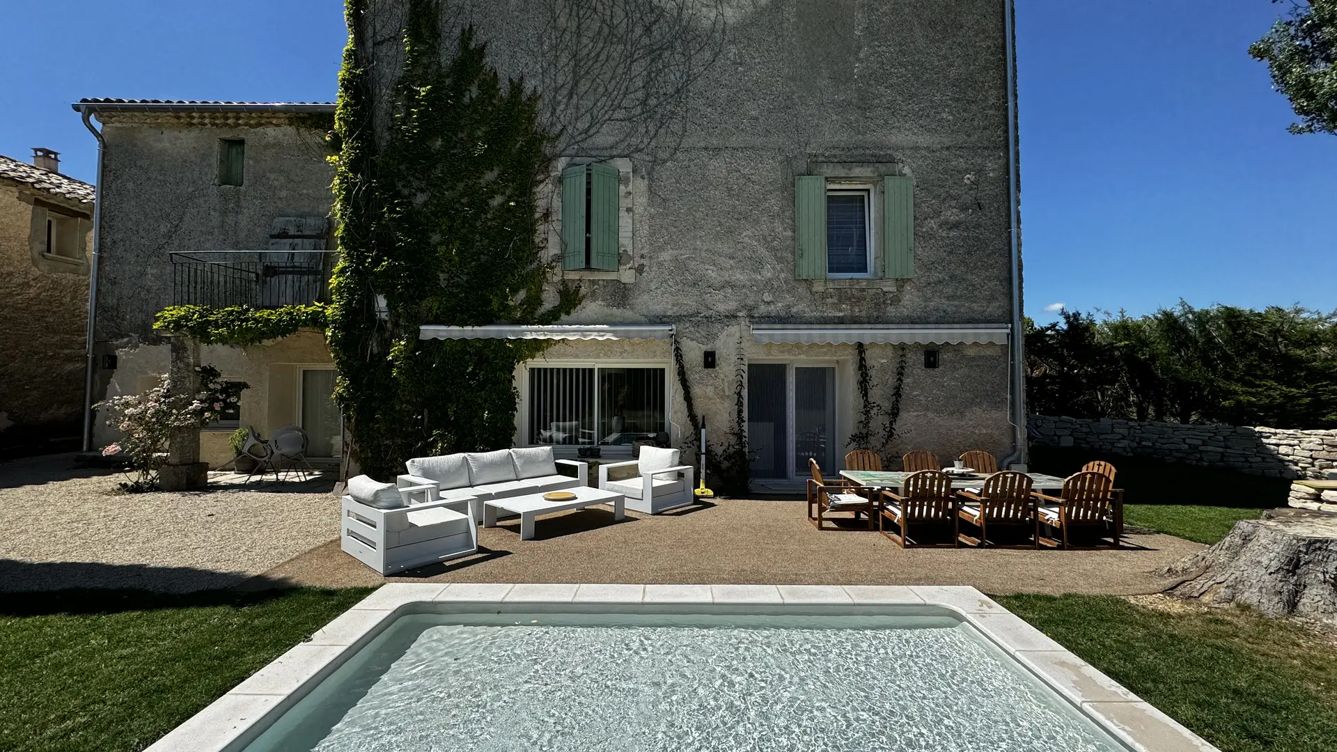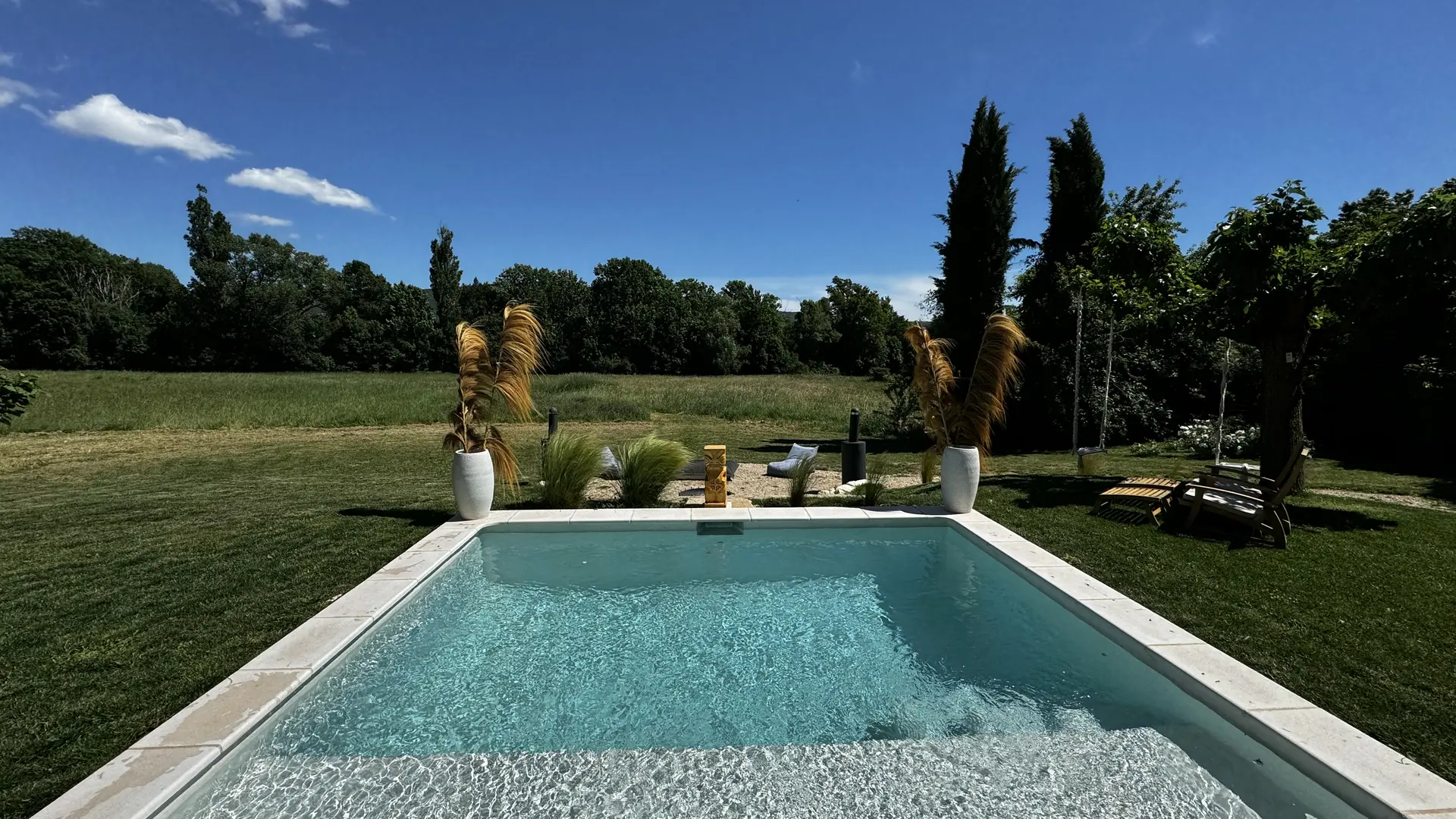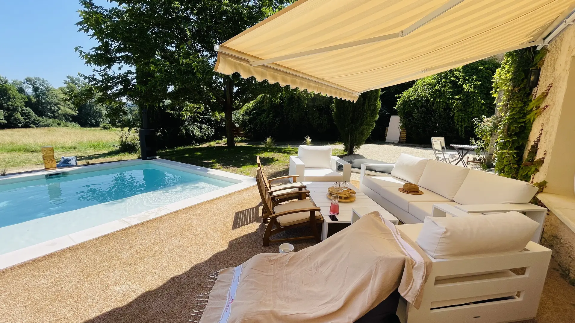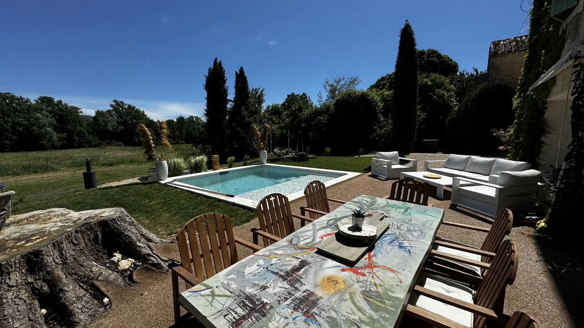 The large outdoor terrace becomes the heart of daily life when Provençal temperatures are mild: enjoying meals in the sun, reading, or sipping an aperitif under the blue sky. The heated private pool completes this idyllic setting, offering a relaxing space with breathtaking views of the meadows and surrounding nature.