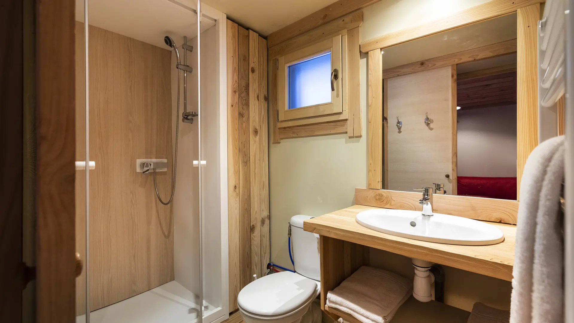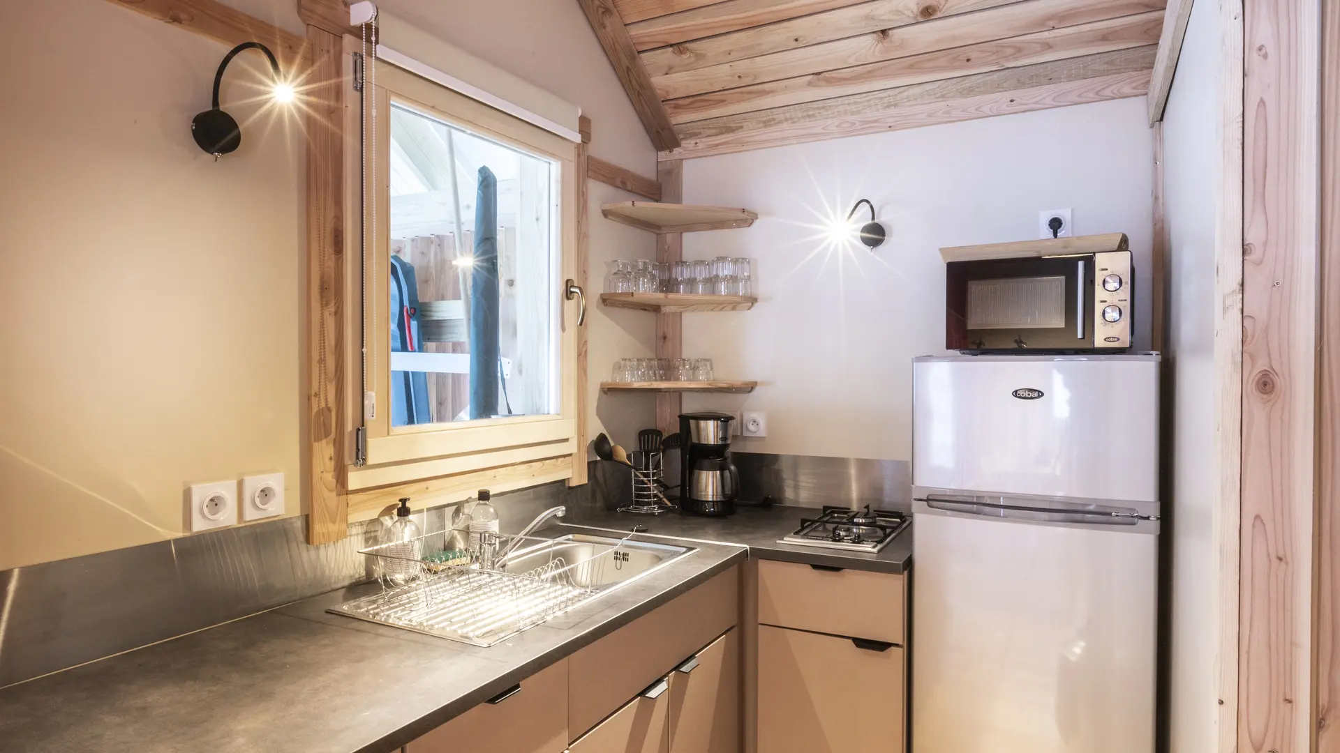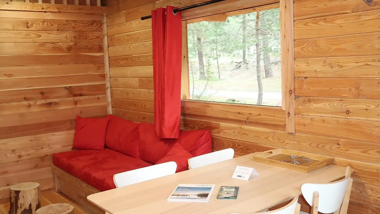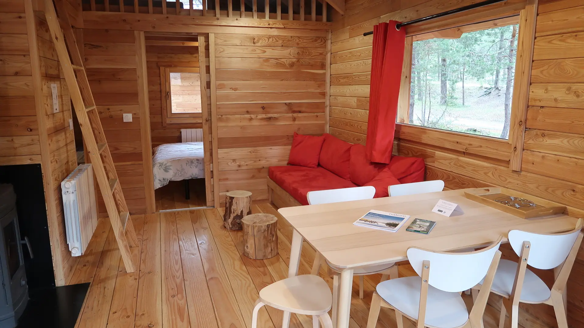 The chalet features a convivial common room, including a fully-equipped kitchen (sink, gas hob, microwave, fridge, electric coffee maker), a dining area with table and chairs for 6, and a cosy lounge area with bench seating and cushions, set around a wood-burning stove. The stock of wood supplied will enable you to take full advantage of this cosy atmosphere, ideal in any season.