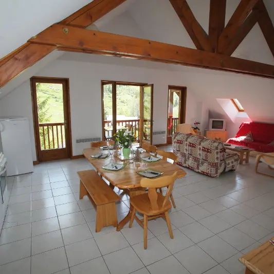 2 bedrooms, one with a double bed, the other with 2 bunk beds and a convertible bed (2 persons), living room with convertible sofa, wc, and storeroom on each level, ski room, bedding provided, electric cooker with 4 hotplates and 1 oven, microwave oven, fridge, dishwasher, washing machine, hoover, duplex with balcony.
