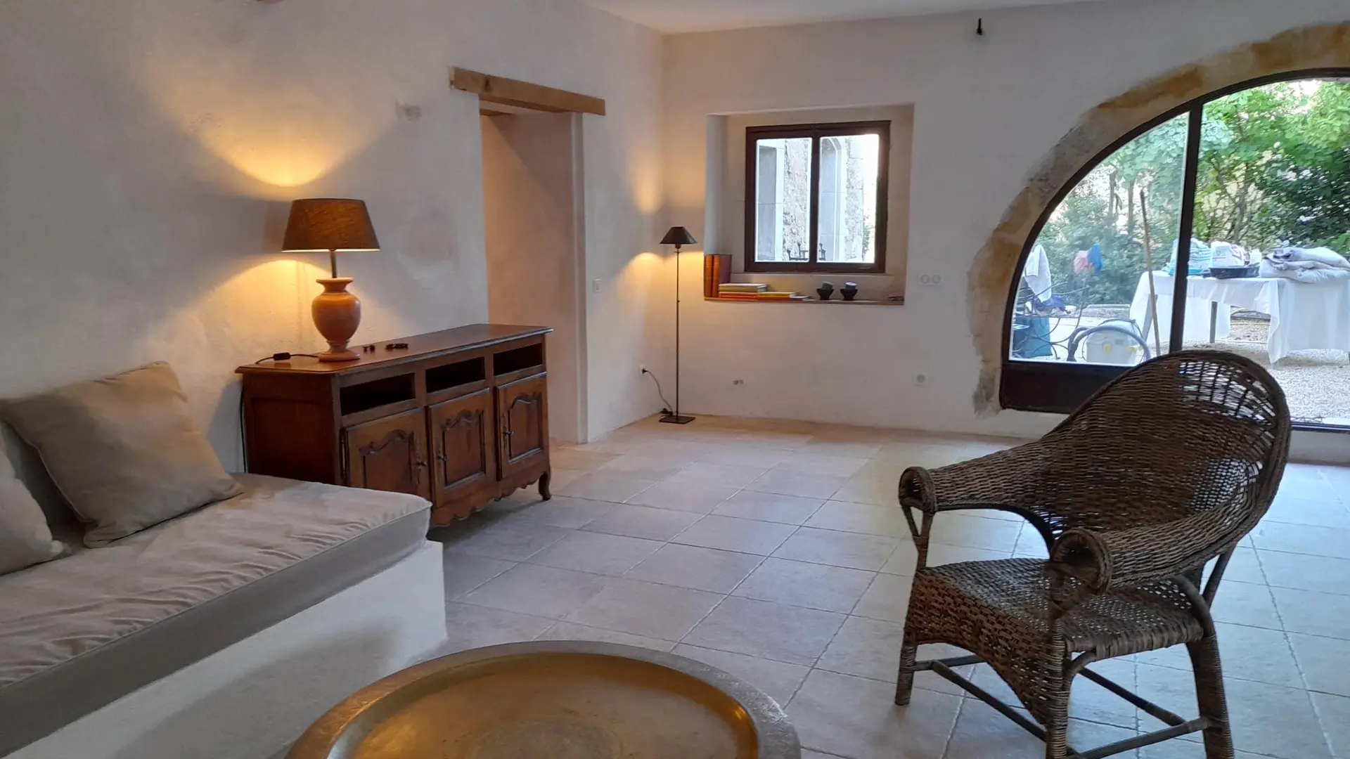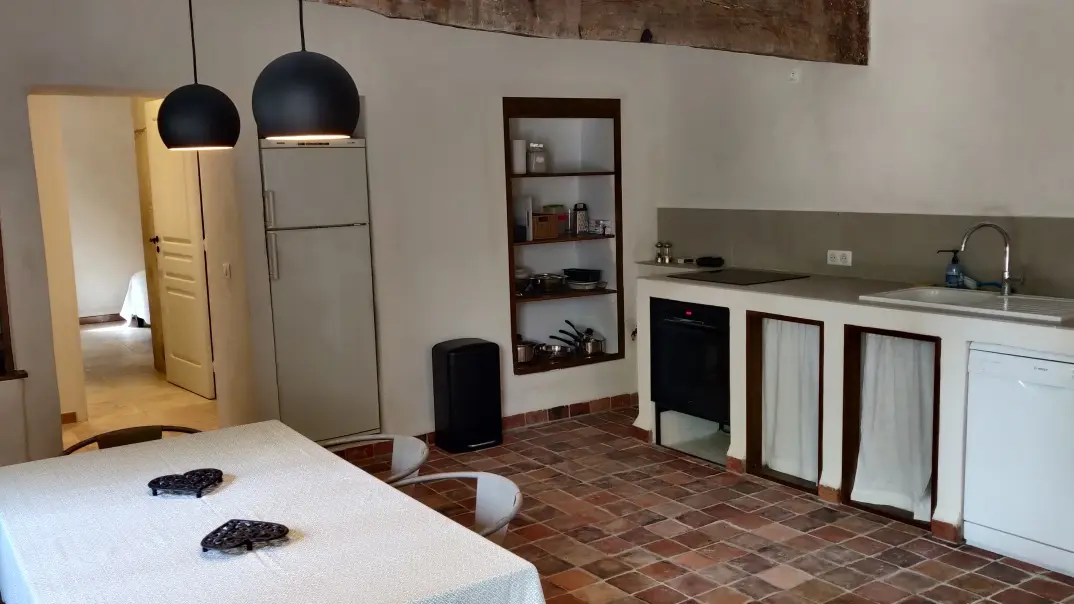 The entrance is through a beautiful kitchen with Provencal floor tiles. From the benches in the very large living room, you have a view over the small courtyard.