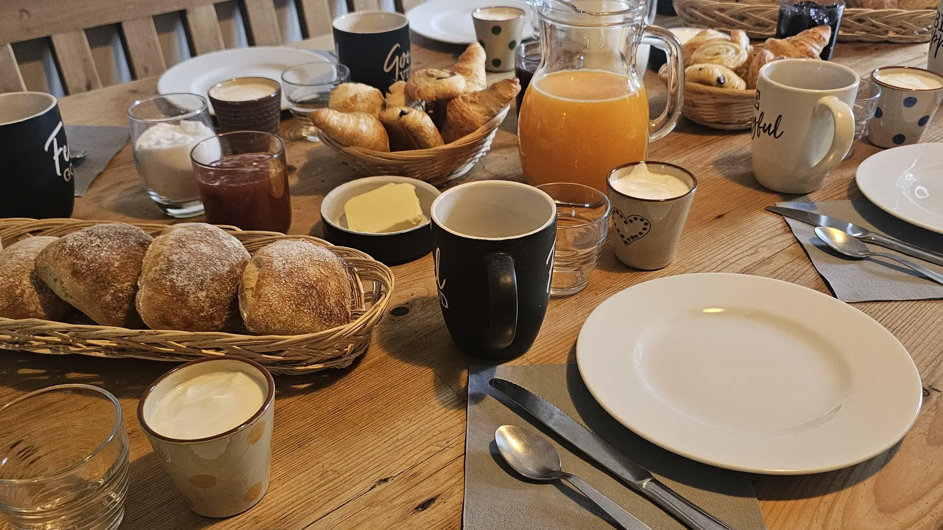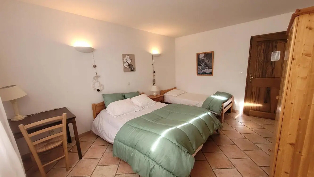 Two double rooms (one 140 cm bed) and two triple rooms (one 140 cm bed + one 90 cm bed), each with private bathroom and toilet. Bed linen and towels are provided.