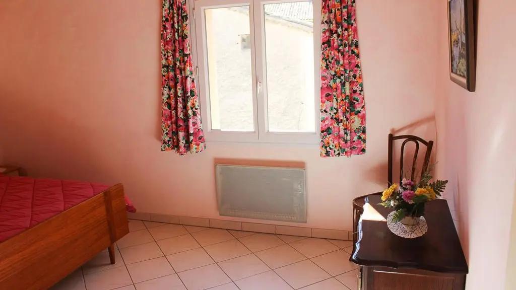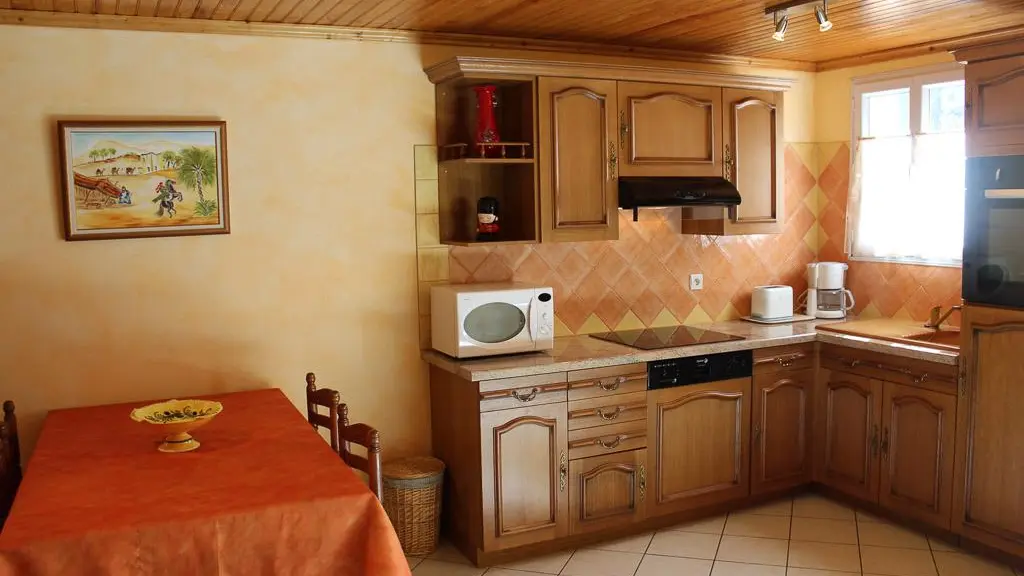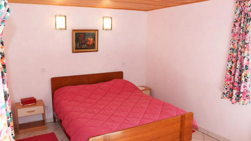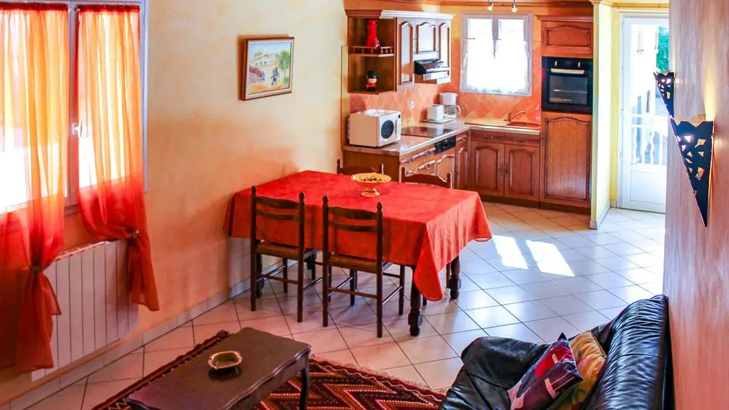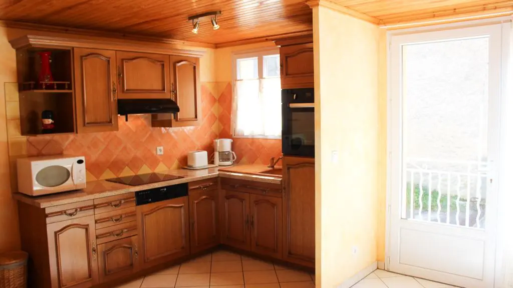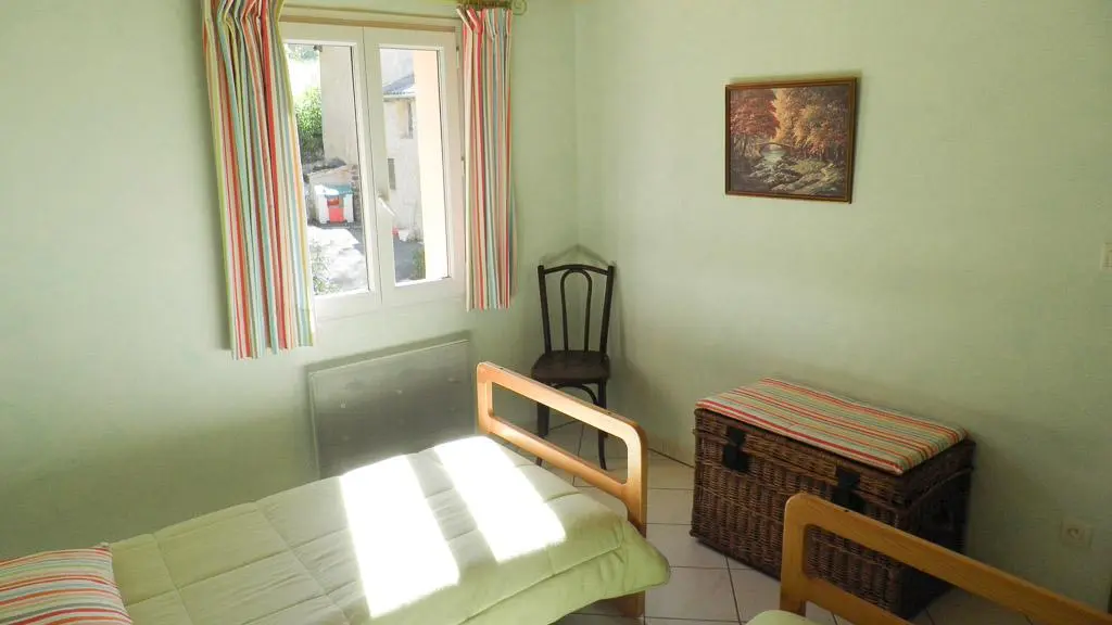 Raised first floor: living room, kitchenette with pantry and sitting area. 1st floor: bedroom with 1 double bed (140cm), bedroom with 2 single beds (90cm), bathroom with shower/wc. Balcony, outdoor space.