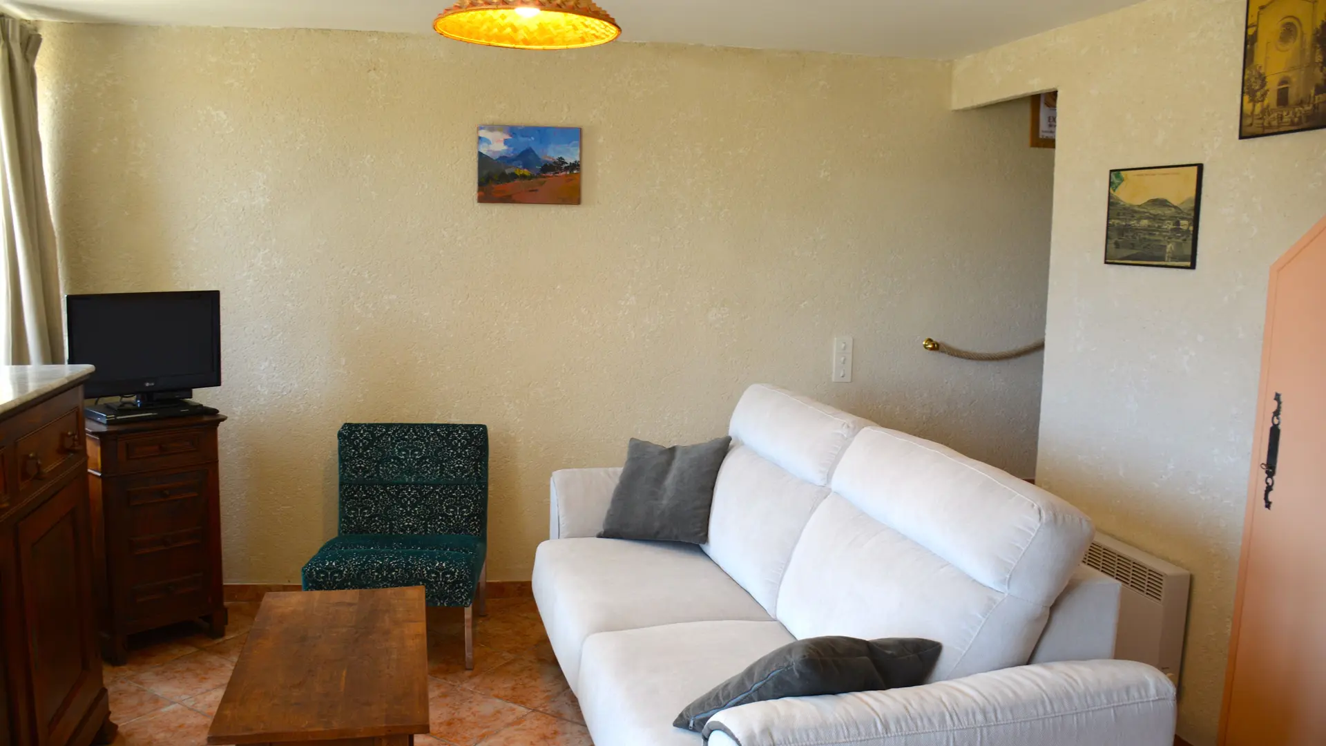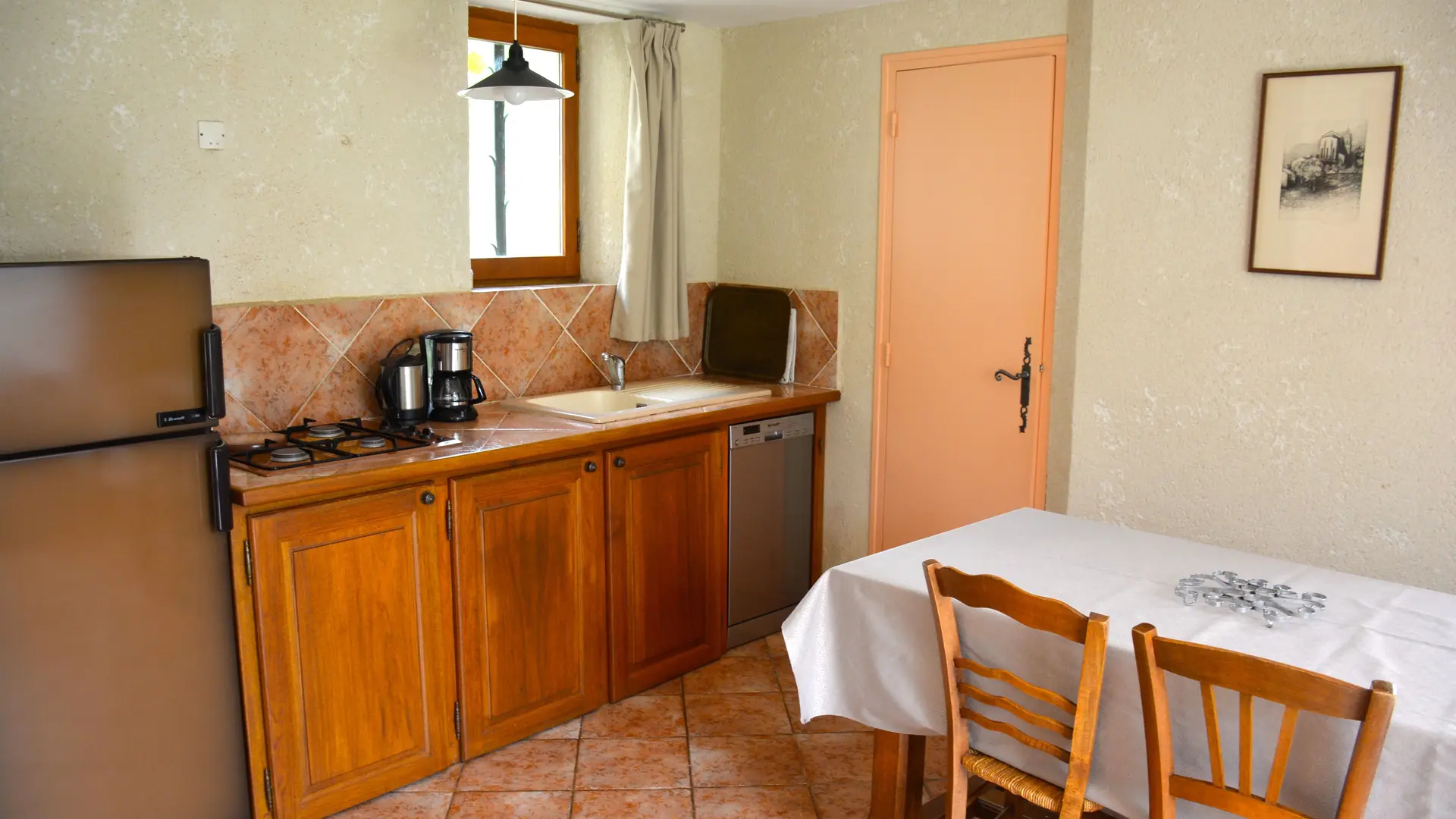 This 50 m², two-storey semi-detached house is located on the outskirts of the village, in an old farmhouse. It comprises :