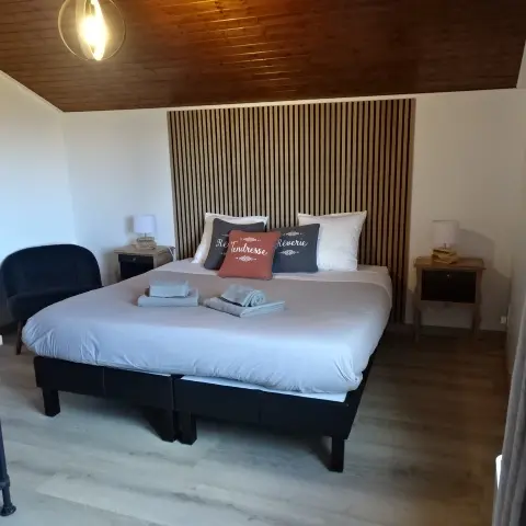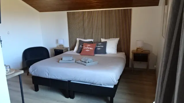 The elegant, modern decor of the Serre Soleille room tastefully blends natural materials. The king-size bed invites you