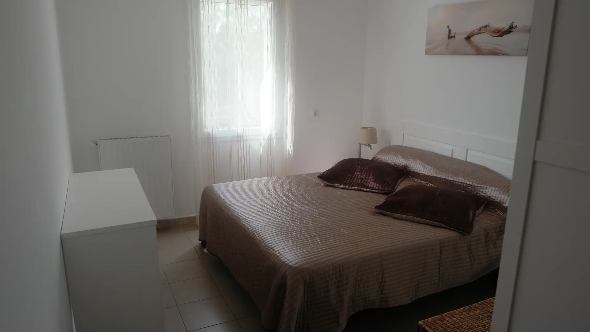 The bedroom has a 160x200 double bed, a large wardrobe with hanging space, two bedside tables and a desk.