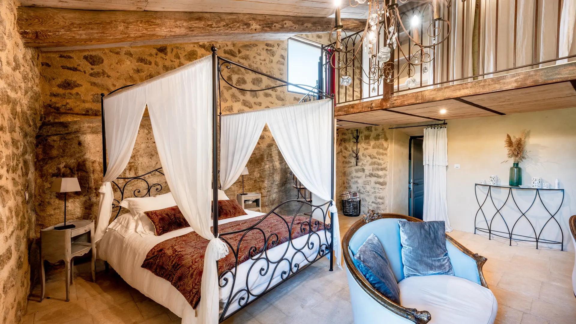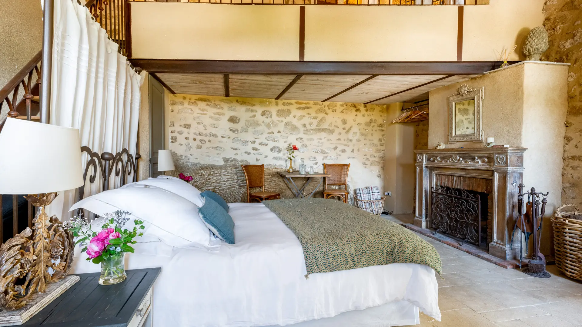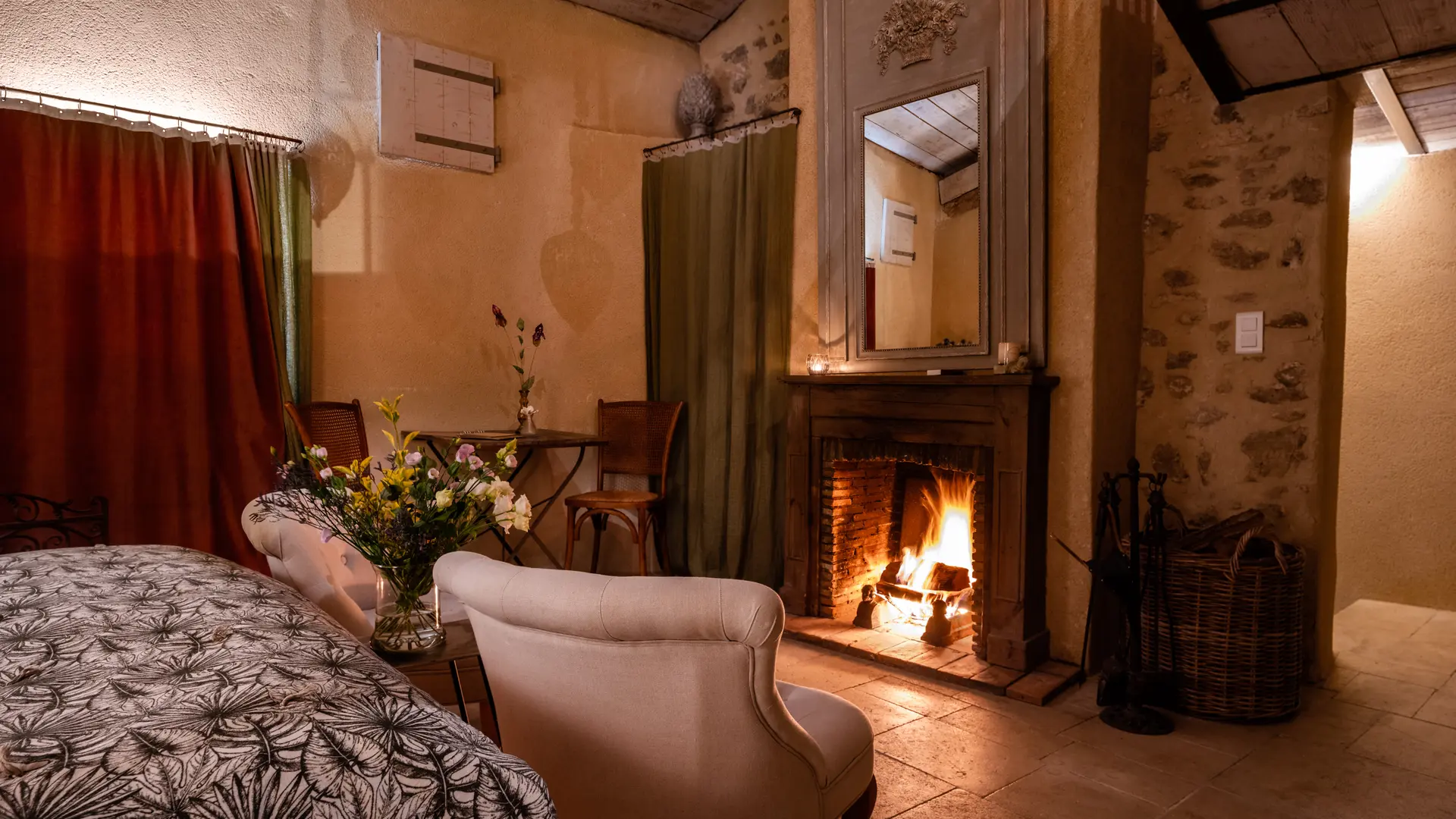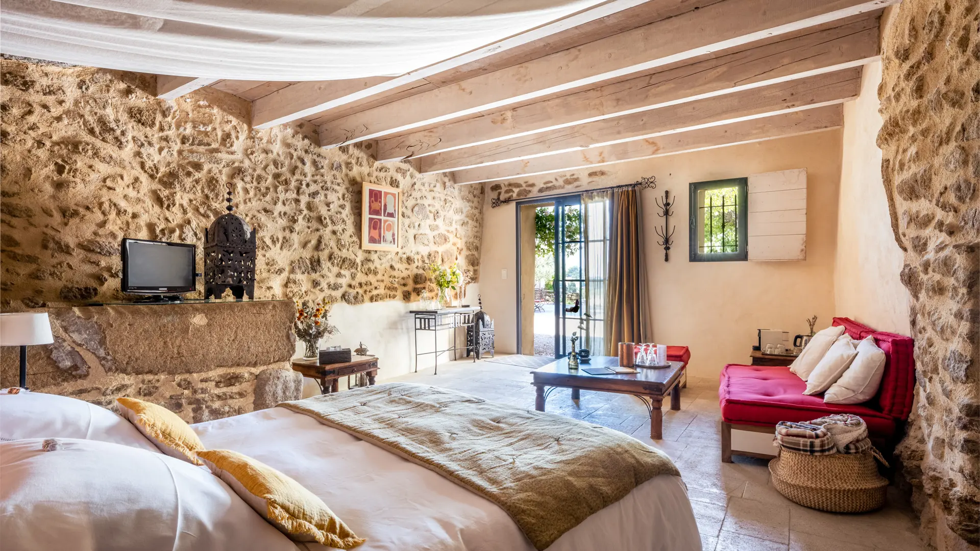 The two duplex suites with fireplace, the family suite, the two semi-troglodyte rooms, all very spacious, as well as the cottage, the Barn, (independent charming cottage for 8 to 10 people with fireplace and private pool), are restored in a refined and original spirit, and let the rocks appear naturally in the rooms.