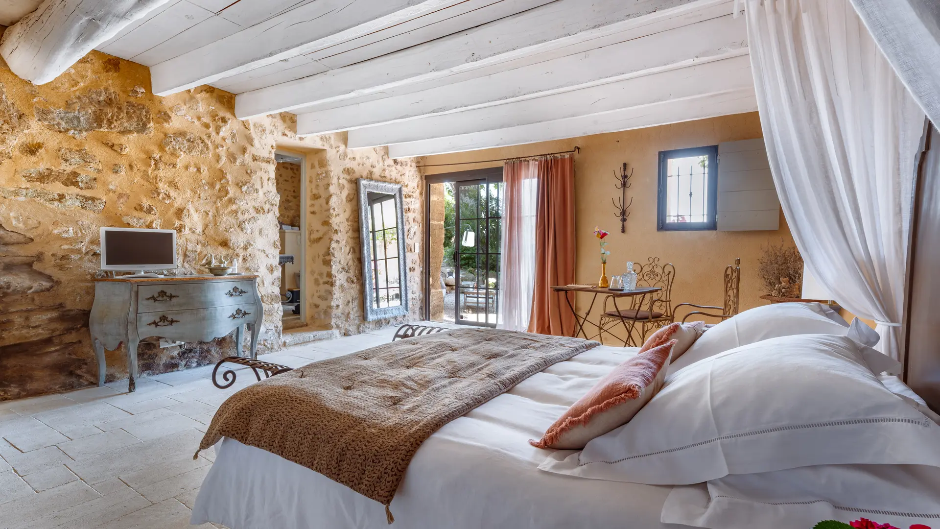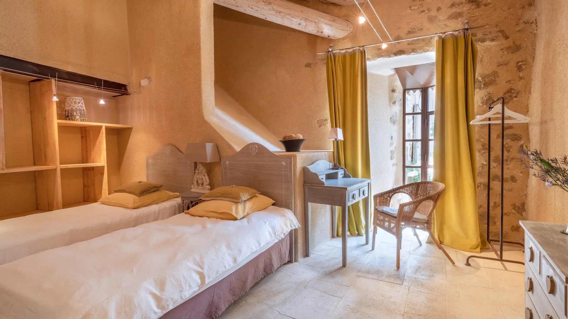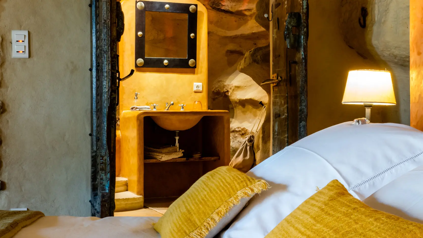 The two duplex suites with fireplace, the family suite, the two semi-troglodyte rooms, all very spacious, as well as the cottage, the Barn, (independent charming cottage for 8 to 10 people with fireplace and private pool), are restored in a refined and original spirit, and let the rocks appear naturally in the rooms.